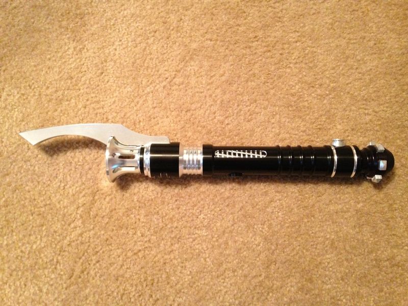 Now I loved the Scorps aggressive look, its pommel, etc - except for the claw and flanged emitter... so I purchased a Dark Menace emitter with windows to continue the overall theme of black heavy with silver accenting: