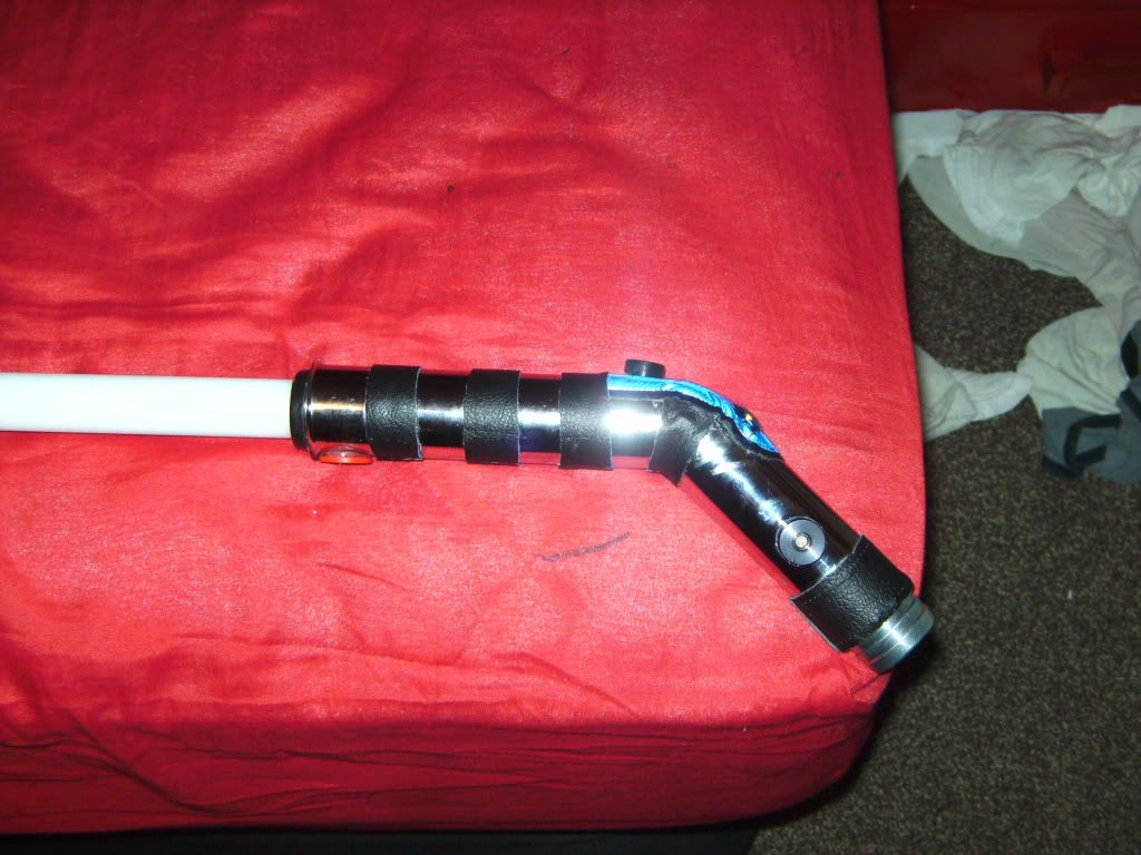 As some of you may know, I created my own Asajj Ventress customized ultrasaber out of an old US Dark Apprentice. I had one other that I decided to go lightside on, and so I had a blue LED in there.... Until now. I've finally made my first fully home made custom lightsaber. I used some plumbing parts to create a PVC-metal fusion saber that has a great curve to it. With the chrome finish on the outer shroud this is one sharp looking saber, and I've put a lot of work into decoration without messing up the form of the saber. I also added a heavy steel piece of pipping in the rear to make it balanced. All in all, I'm thrilled with this weapon. I ended up using a Li-Ion battery pack to power it since I had to take them out of my Consular when I added sound to it.
