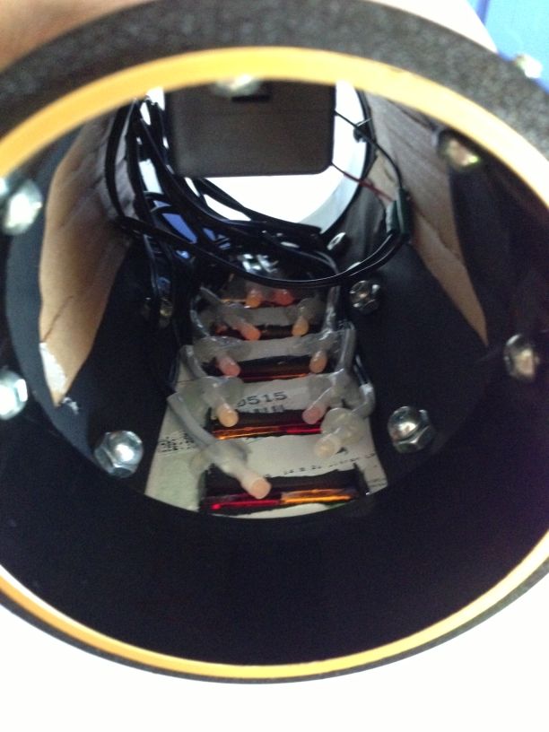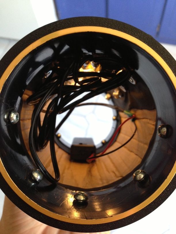 I started running out of time, so I forgot to take more WIP pictures.  Tongue  The cardboard gets wrapped in vinyl and glue-gunned secure on the inside and holes are sliced to allow the indicators and little switches to be inserted through the cardboard frame.  I rolled another piece of cardboard into a tube and covered it in vinyl as well.  This was secured to two speaker brackets with nuts and bolts (which I'm going to replace with some Chicago screws to make it flush, I don't like the pointy bolts and visible nuts).  I had to use a power drill to make the holes in the plastic bracket.