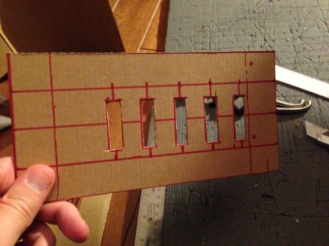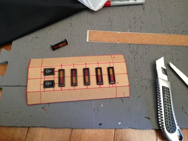 The base of the bracer is cardboard - this might have actually been the hardest part - measuring precisely where the indicators would sit and cutting out nice uniform holes.  I went through several arrangements before settling on one that would space properly on the panel I had available.  I actually dissembled the indicators to use only the translucent coloured windows - I'm not smart enough to know how to power and program the individual lights that were inside them, so they went in the trash.   Smiley