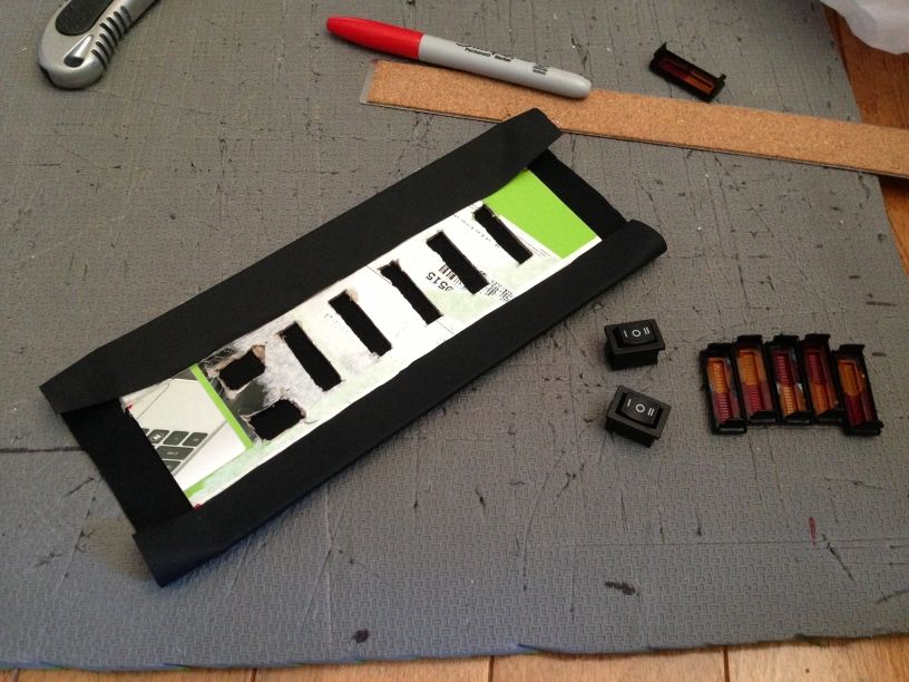 The main components for this piece were cardboard, a thin matte black vinyl, some two-colour indicator lights and a solar powered LED string from Ikea (as well as some other misc greebles).