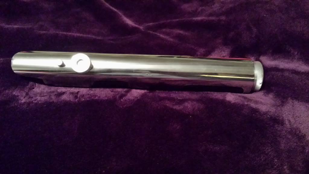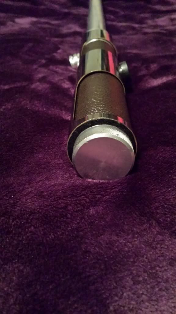 I plan on doing a simular shroud for one of my Dominix V2. I'll break it down in pics for that one. I didn't take many pics for this shroud.  Basically I took the tube and set it beside the saber. I put tape on the tube for marking. I marked where I wanted the cuts and I used a band saw to make the cuts. I'm not very good at working with metal, but I work with many people whom are. One of them cleaned up all the edges, and then I slipped the saber in and measured for the switch hole and carefully drilled it out. I put the switch in so I could measure for the retention and mount hole on top. The retention was a 8/32 tapped hole while the other hole was 6/32. I had no idea how to measure and drill the holes. Another friend at work did. He used a simular method as I had for cutting the tube. He taped it off and took measurements as the saber was placed with the switch in, and marked and drilled them. I had the Covertech wheel with me and found the other mount screw at work. I had the leather as well, it was a piece of scrap I had the luck of finding a few weeks ago. Once assembled there was a small gap, roughly 1/16 between the shroud and the base of the saber where the pommel goes. I found a roll of thick felt like material that had a peel and stick side. I tried that down and fit it into the base of the shroud. Then installed the harness and components.