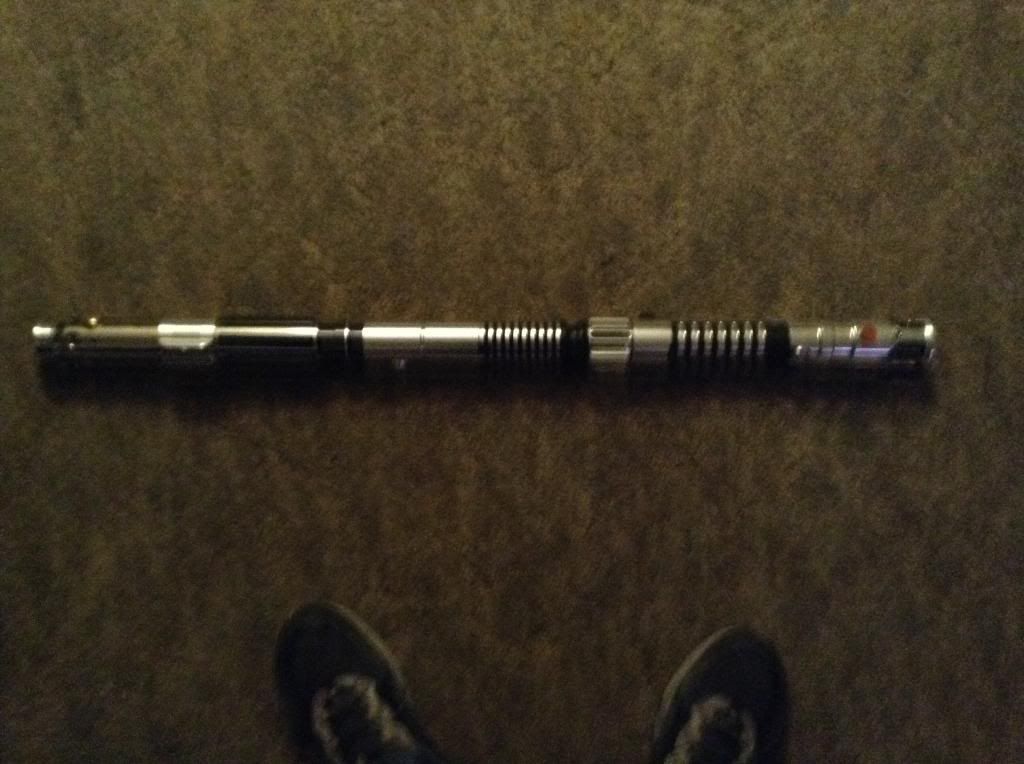Here's my latest custom, I love the way it turned out! I drilled through the vents on the bottom of the pommel and now I am using it as an emitter! I have an older saber that I did this same thing with the pommel from my Luke MR. It feels very comfortable, and it's very well weighted. My only complaint is that the blade wiggles ever so slightly. I had to drill the retention screw way down on the choke, if it was higher up the blade might not wiggle as much. Oh well.   I think I'll keep it like this for a while. I'm developing an exiled Jedi character and in the story this is his latest saber. Sent from my XT907 using Tapatalk 2