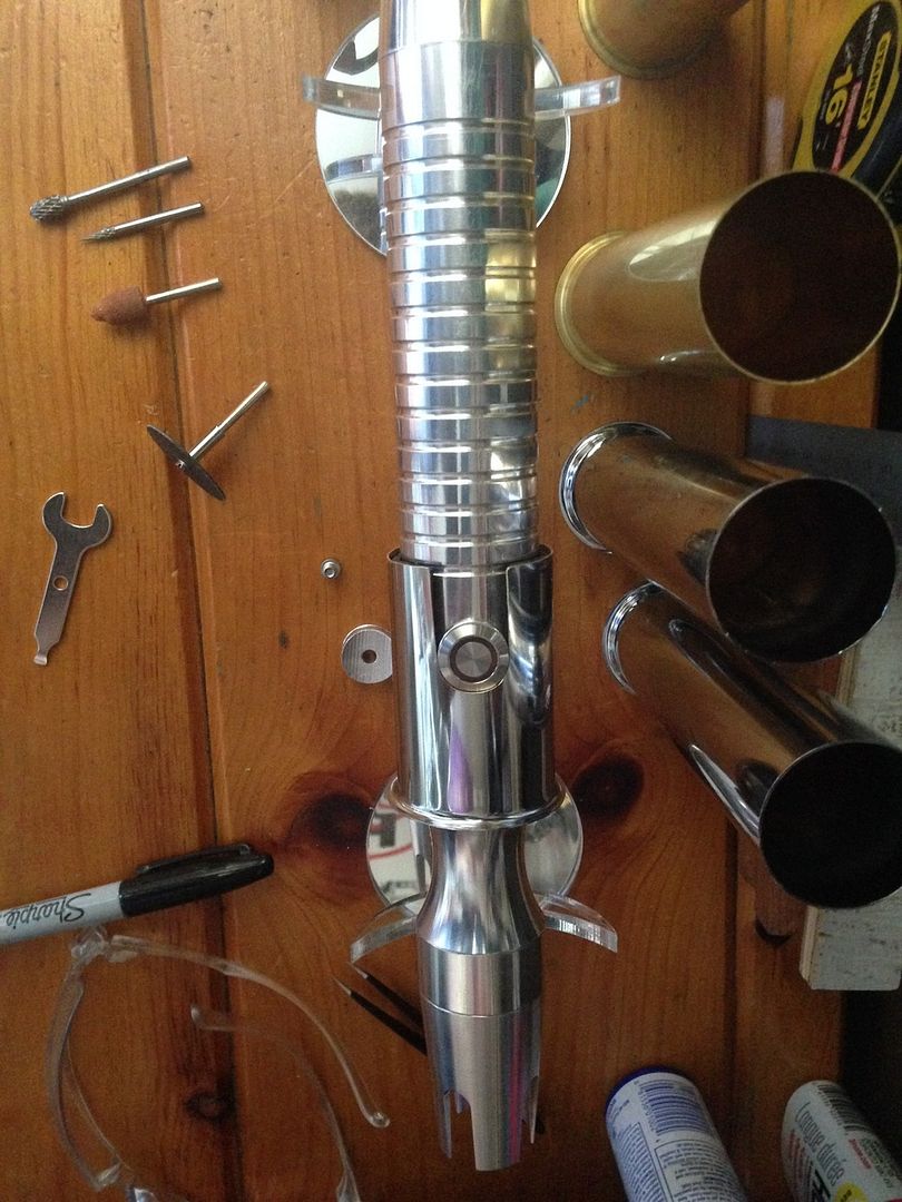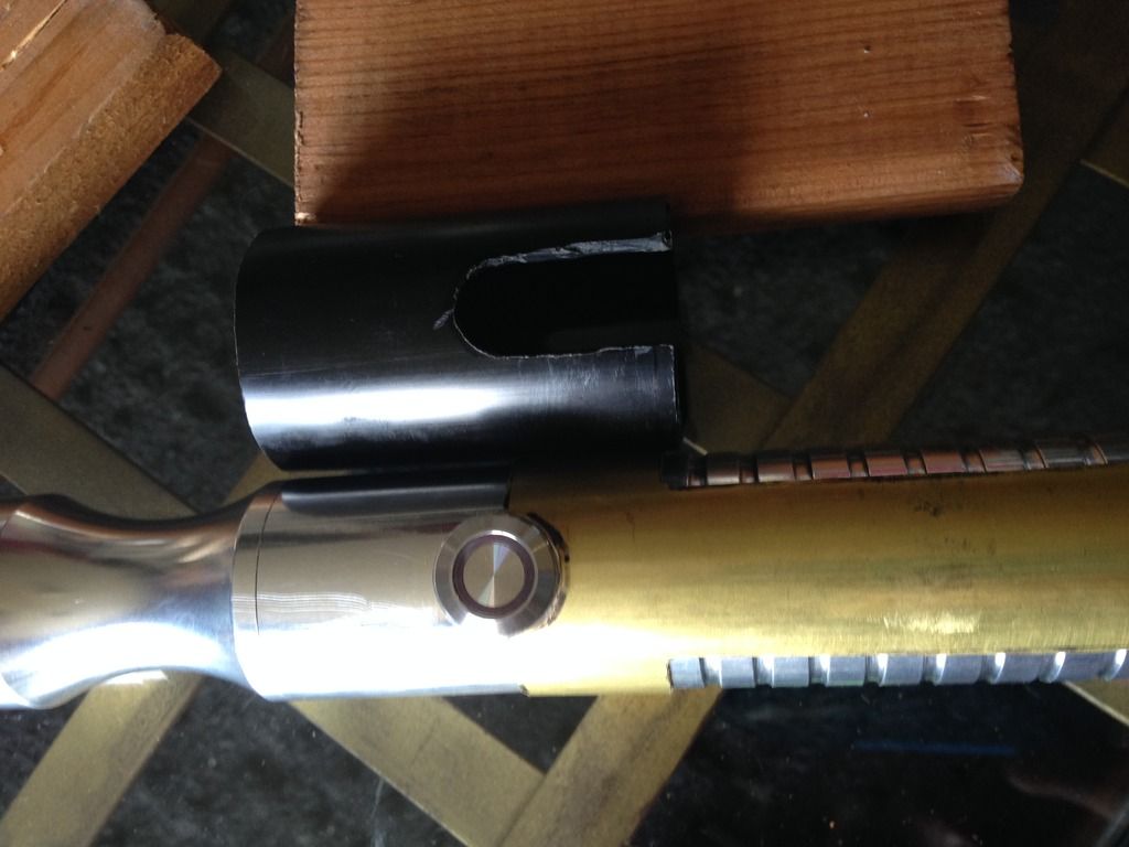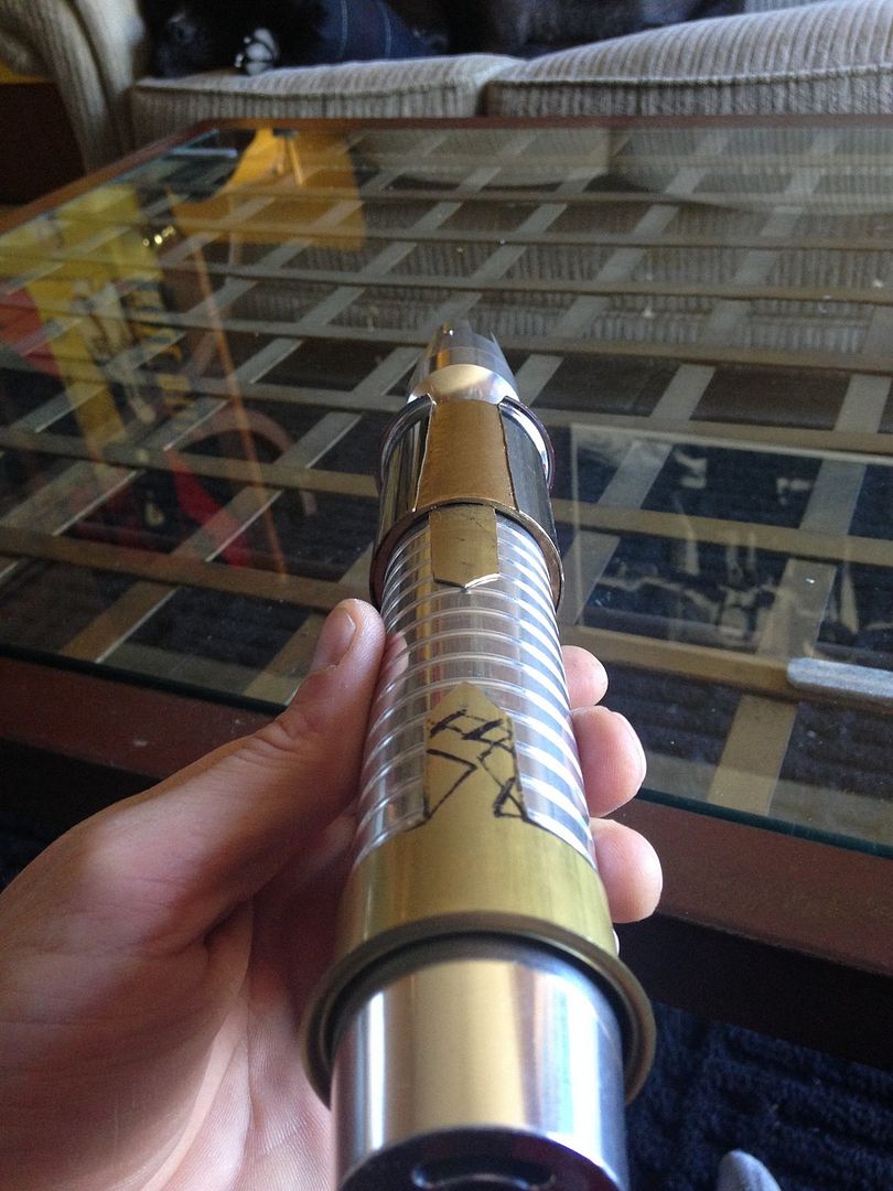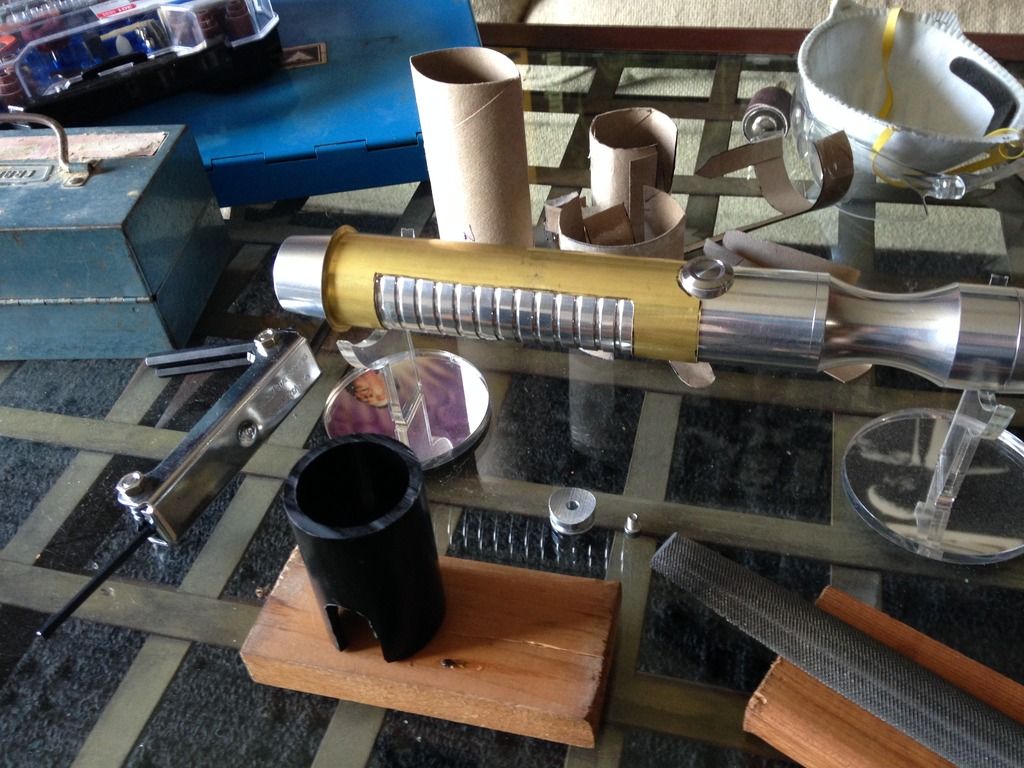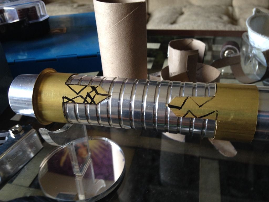 Hey everyone  . For my first mod, I imagined what my saber would be like if I was a legendary Sith emperor. I wanted to do this first project right from scratch using stuff from around the apartment/ hardware store, and actually make the parts etc.- I'll save the pro/ stock parts for the next project. I've got a TON of work left ahead of me for this, but here's a glimpse of the rough work I've done so far and a mini step by step: I decided to use my emerald catalyst (with red illuminated switch) because of its elegant/ regal, yet mean, look. I started by making cardboard templates from paper towel tubes like I saw in srams post for pvc shrouds, and applied them to a section of pvc and also some brass tail-pieces / pipe inserts by simply tracing. Then I used tape to make all the lines nice and straight /fine tuned.      I cut out the pvc piece, which will form an outer/ thicker shroud to make the av switch low pro, and a brass insert, which will form an inner shroud, creating a layered look, defining the grip area, and giving me a hand stop down by the pommel. Did the cutting with a dremel and cutting disk, round burr, fine pencil pointed burr, and various grinding/ sanding bits. I had to remove a ton of material from the inside of the pvc to fit lol. A drill press and drum sanding bit came in handy, but the burr also helped.     I thought about cutting a fancier pattern into the back of the inner shroud, but decided that the points would look the best, and execute better in the end. Then I repeated the process on another insert to overlap the outer shroud, giving me another flange at the choke right before the emitter, for a regal, bad ass look and great hand stop. I cut a seam down the spine of this piece once I had it shaped, to allow it to fit over the larger pvc piece, and I will be embellishing this seam and incorporating into overall design.       I did some more work shaping and fitting the pieces.      I've got a ton more to do- creating, cleaning up/ fitting pieces, tapping holes to secure them, as well as for more blade retention, plus I'm going to do the grooves in aluminum black, and also re- finish/ engrave/ paint the hilt... Yikes I better get back at it lol! Keep you posted, MTFBWY