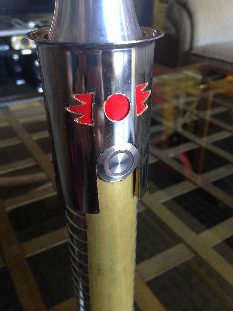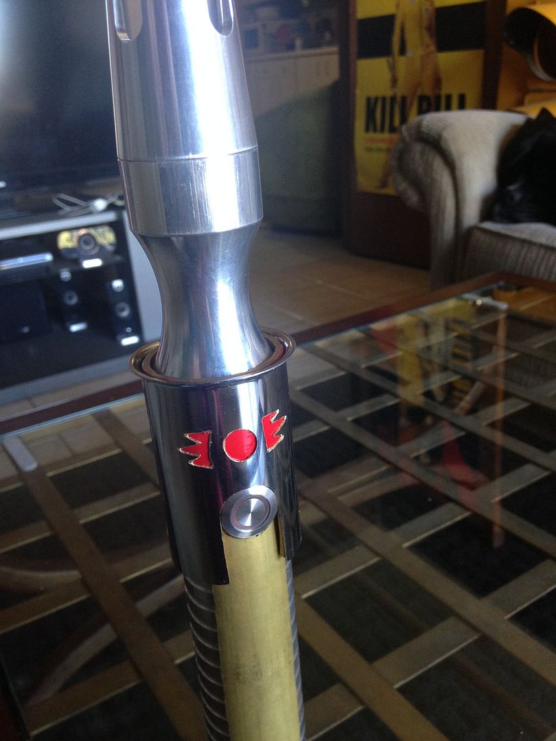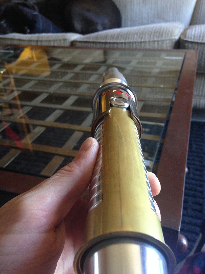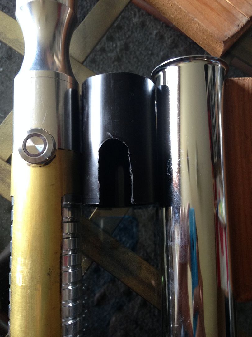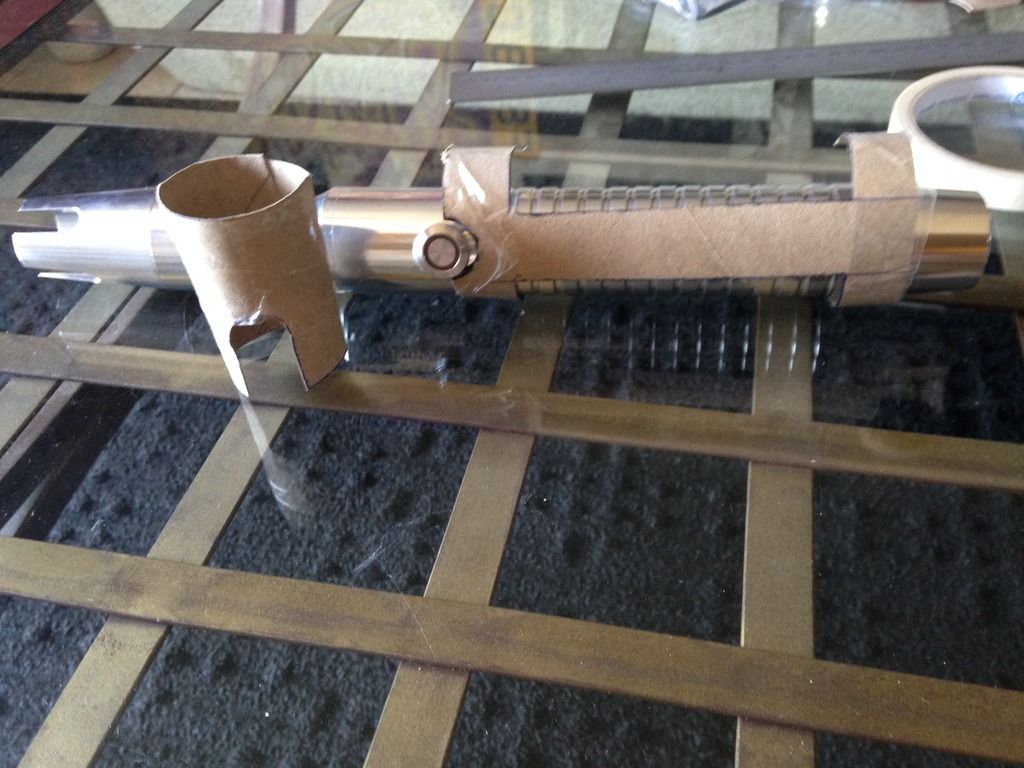 Hey everyone  . For my first mod, I imagined what my saber would be like if I was a legendary Sith emperor. I wanted to do this first project right from scratch using stuff from around the apartment/ hardware store, and actually make the parts etc.- I'll save the pro/ stock parts for the next project. I've got a TON of work left ahead of me for this, but here's a glimpse of the rough work I've done so far and a mini step by step: I decided to use my emerald catalyst (with red illuminated switch) because of its elegant/ regal, yet mean, look. I started by making cardboard templates from paper towel tubes like I saw in srams post for pvc shrouds, and applied them to a section of pvc and also some brass tail-pieces / pipe inserts by simply tracing. Then I used tape to make all the lines nice and straight /fine tuned.      I cut out the pvc piece, which will form an outer/ thicker shroud to make the av switch low pro, and a brass insert, which will form an inner shroud, creating a layered look, defining the grip area, and giving me a hand stop down by the pommel. Did the cutting with a dremel and cutting disk, round burr, fine pencil pointed burr, and various grinding/ sanding bits. I had to remove a ton of material from the inside of the pvc to fit lol. A drill press and drum sanding bit came in handy, but the burr also helped.     I thought about cutting a fancier pattern into the back of the inner shroud, but decided that the points would look the best, and execute better in the end. Then I repeated the process on another insert to overlap the outer shroud, giving me another flange at the choke right before the emitter, for a regal, bad ass look and great hand stop. I cut a seam down the spine of this piece once I had it shaped, to allow it to fit over the larger pvc piece, and I will be embellishing this seam and incorporating into overall design.       I did some more work shaping and fitting the pieces.      I've got a ton more to do- creating, cleaning up/ fitting pieces, tapping holes to secure them, as well as for more blade retention, plus I'm going to do the grooves in aluminum black, and also re- finish/ engrave/ paint the hilt... Yikes I better get back at it lol! Keep you posted, MTFBWY