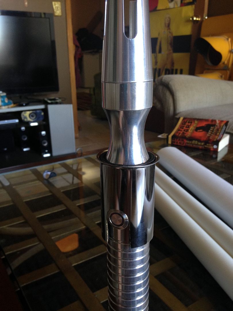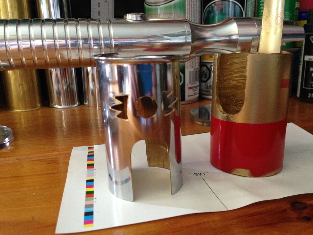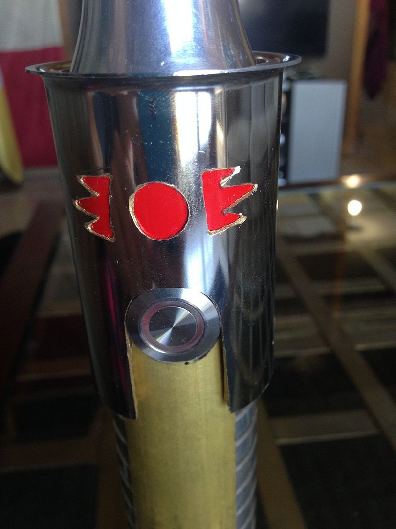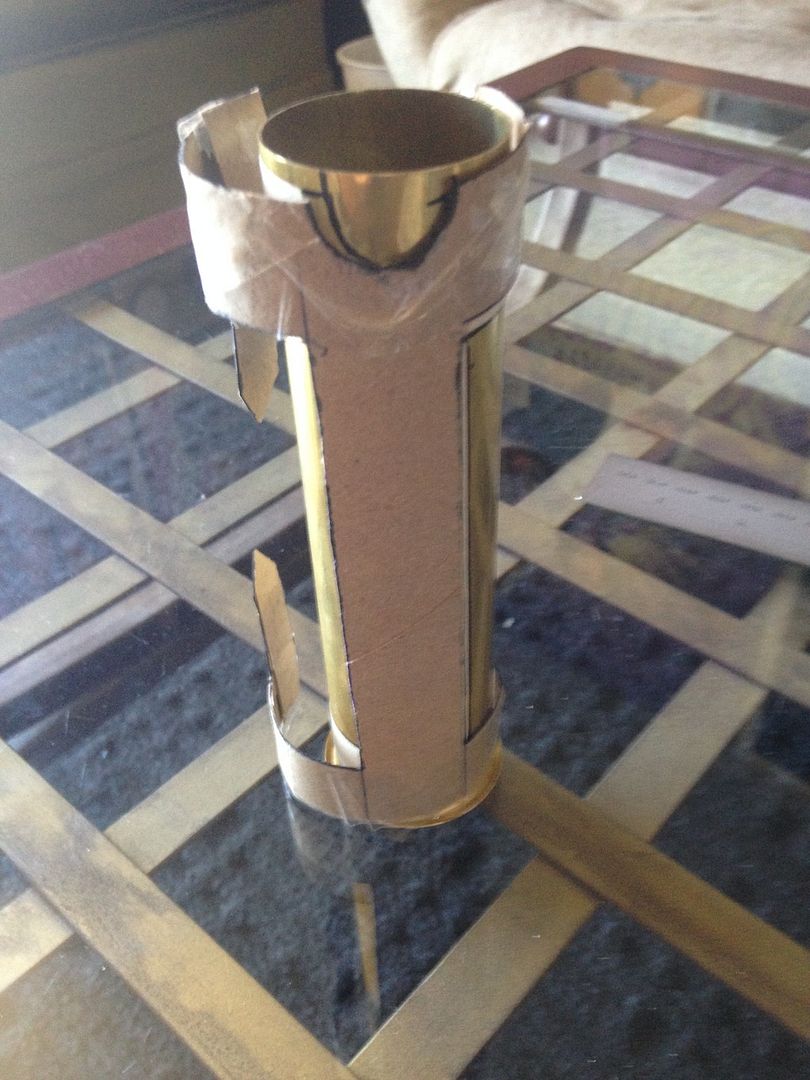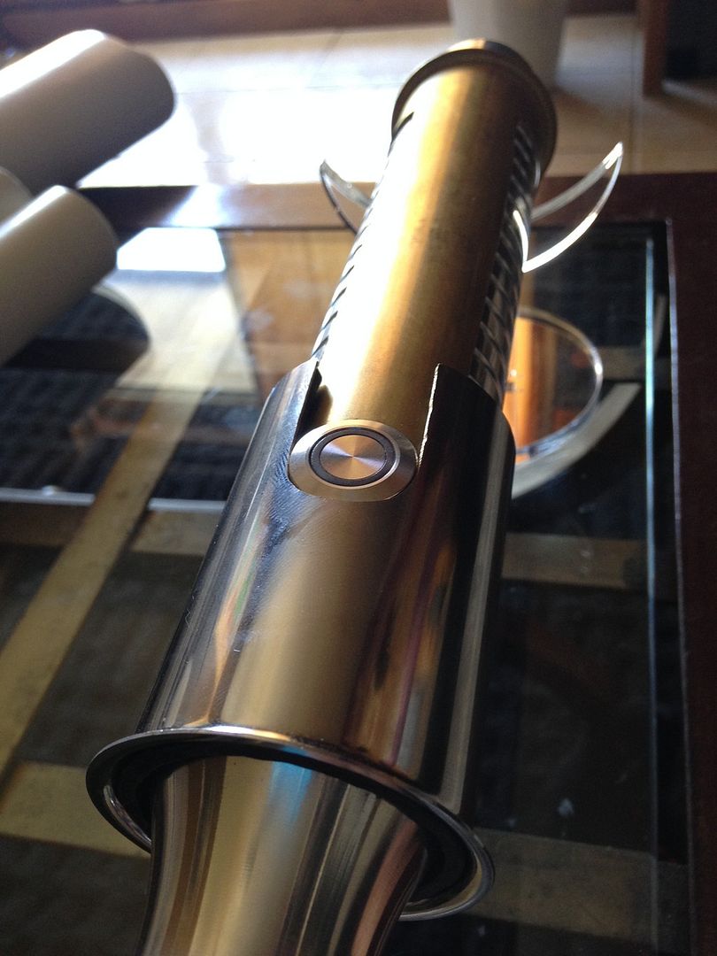 Hey everyone  . For my first mod, I imagined what my saber would be like if I was a legendary Sith emperor. I wanted to do this first project right from scratch using stuff from around the apartment/ hardware store, and actually make the parts etc.- I'll save the pro/ stock parts for the next project. I've got a TON of work left ahead of me for this, but here's a glimpse of the rough work I've done so far and a mini step by step: I decided to use my emerald catalyst (with red illuminated switch) because of its elegant/ regal, yet mean, look. I started by making cardboard templates from paper towel tubes like I saw in srams post for pvc shrouds, and applied them to a section of pvc and also some brass tail-pieces / pipe inserts by simply tracing. Then I used tape to make all the lines nice and straight /fine tuned.      I cut out the pvc piece, which will form an outer/ thicker shroud to make the av switch low pro, and a brass insert, which will form an inner shroud, creating a layered look, defining the grip area, and giving me a hand stop down by the pommel. Did the cutting with a dremel and cutting disk, round burr, fine pencil pointed burr, and various grinding/ sanding bits. I had to remove a ton of material from the inside of the pvc to fit lol. A drill press and drum sanding bit came in handy, but the burr also helped.     I thought about cutting a fancier pattern into the back of the inner shroud, but decided that the points would look the best, and execute better in the end. Then I repeated the process on another insert to overlap the outer shroud, giving me another flange at the choke right before the emitter, for a regal, bad ass look and great hand stop. I cut a seam down the spine of this piece once I had it shaped, to allow it to fit over the larger pvc piece, and I will be embellishing this seam and incorporating into overall design.       I did some more work shaping and fitting the pieces.      I've got a ton more to do- creating, cleaning up/ fitting pieces, tapping holes to secure them, as well as for more blade retention, plus I'm going to do the grooves in aluminum black, and also re- finish/ engrave/ paint the hilt... Yikes I better get back at it lol! Keep you posted, MTFBWY