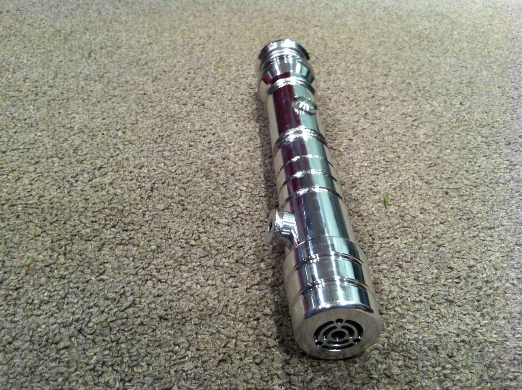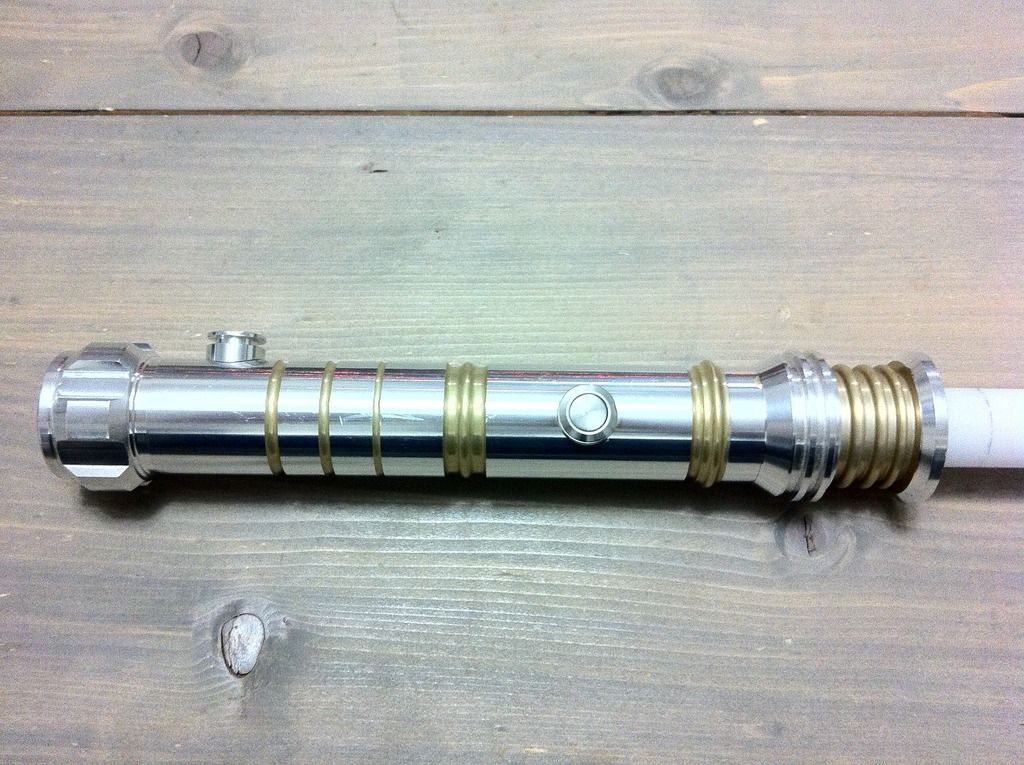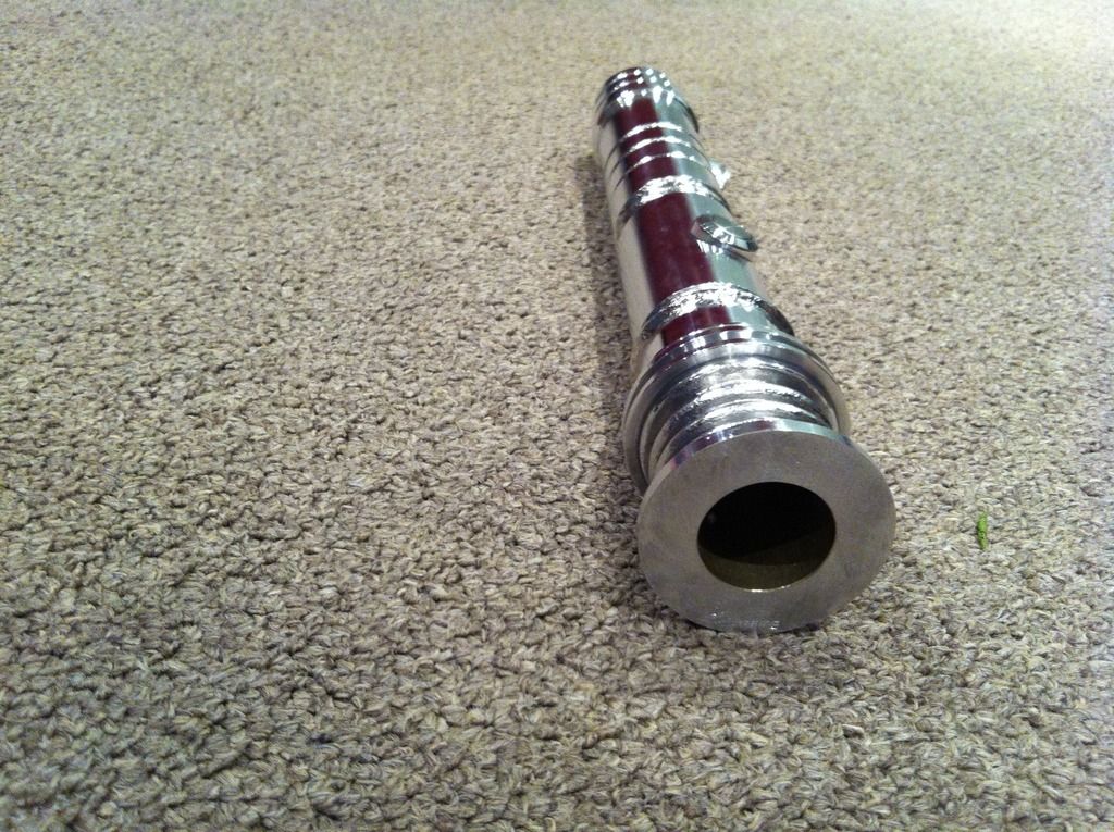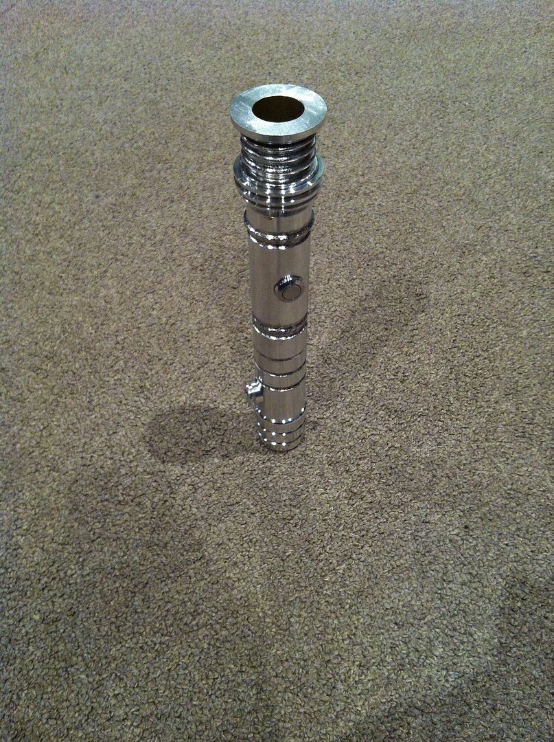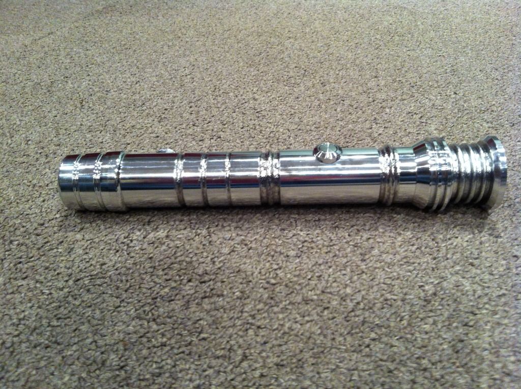Shocked   Wow Haz I am so proud of you and your wife's good suggestions.  Looks so much better with the texturizing in the groove and raised ring areas when compared to a standard silver Shock.  The buffing came out so strikingly rich.  The Shock pommel really belongs on this saber now.  Well done and enjoy this clean shiny beauty.  Wink   Jaina Solo would be envious and I'd like to see this with a purple blade.  +1 for you.   Cool