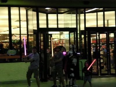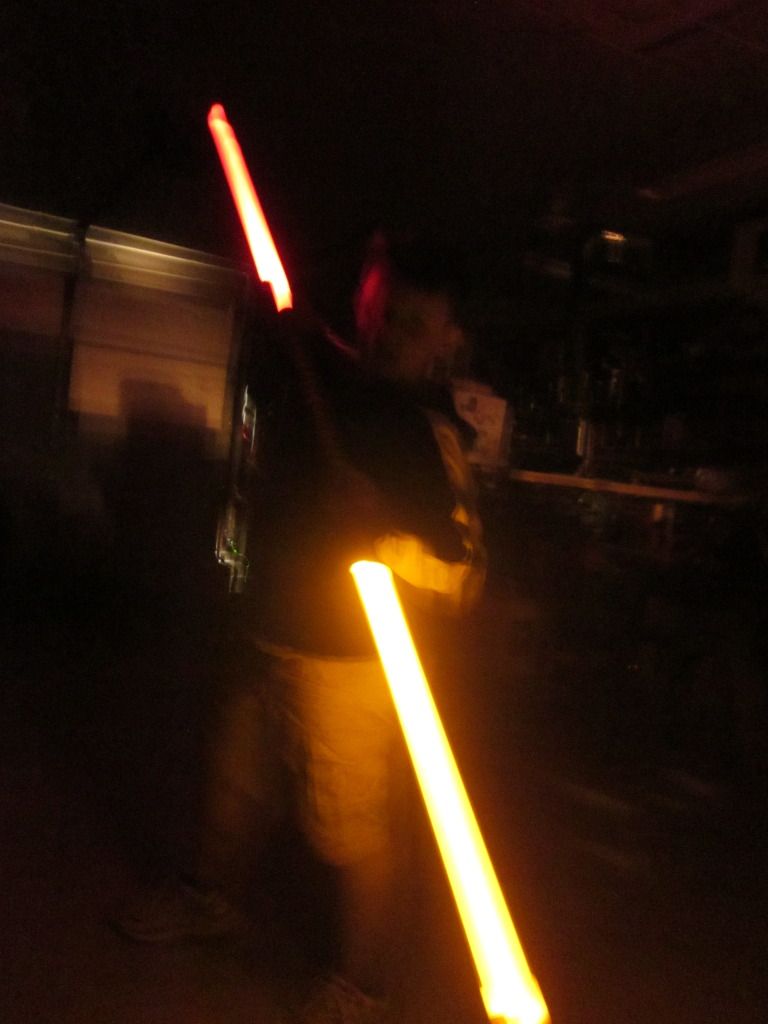 That's awesome! I love hearing stories like that. I notice in my area, when I start talking about lightsabers and what-not people usually scoff or tease and say they think it's silly for me to be into stuff like that. But last saturday on my birthday I decided to go dancing with a couple lightsabers. I took my prophecy to demonstrate the color changing option, and my bellicose to demonstrate the sound and FoC and AV switch options. At first I just kind of chilled over to one side, and then I turned them on and did some spinning to the music. Then I stopped and went to get a drink of water. I had about ten people approach me and start asking me all about them, so I showed them everything and let them handle them, watching as their face would light up the moment they held one. I passed out every Ultrasabers card I had. This happened the rest of the night, with little lulls here and there. I saw a friend of mine there and let her dance with my Bellicose and I took this pic of her:  It was a pretty fun night, and I believe there are a lot of closet fans that just don't admit they like stuff until you wave a lightsaber in their line of sight. Then they can't stop talking about how cool it is. haha, I choose to just be open and honest about it, why play like I don't like stuff I like?
