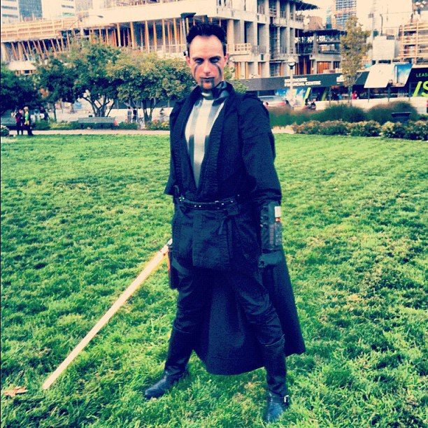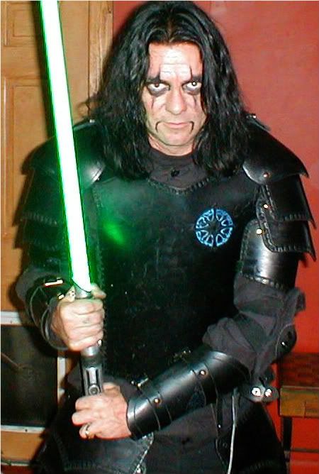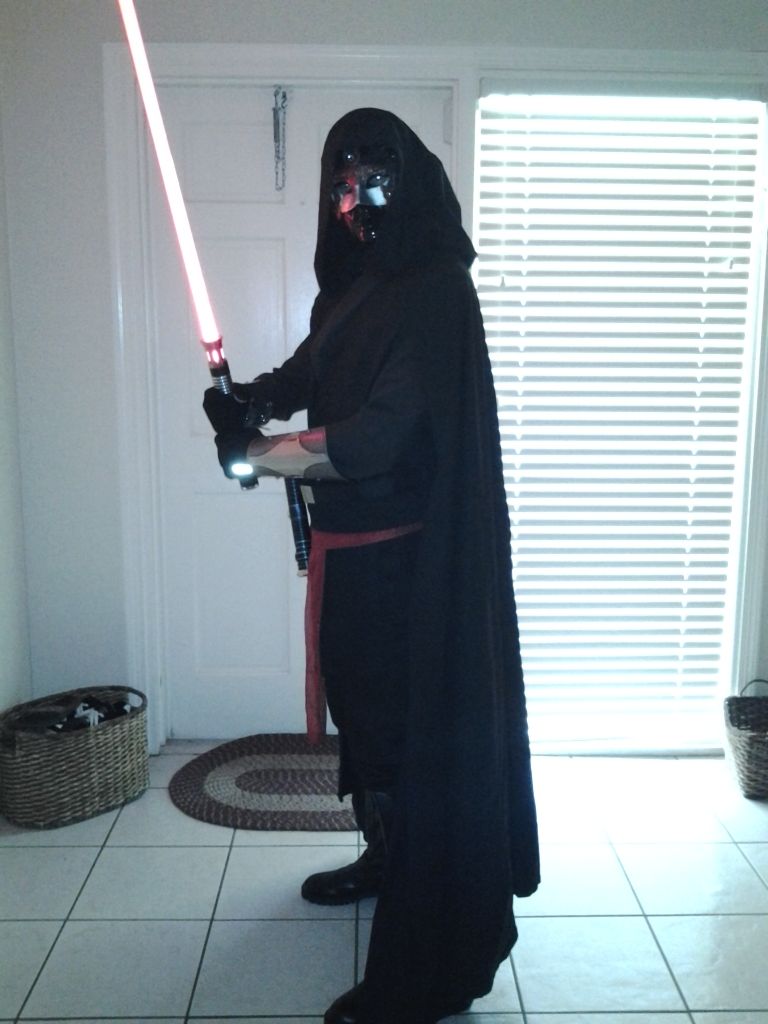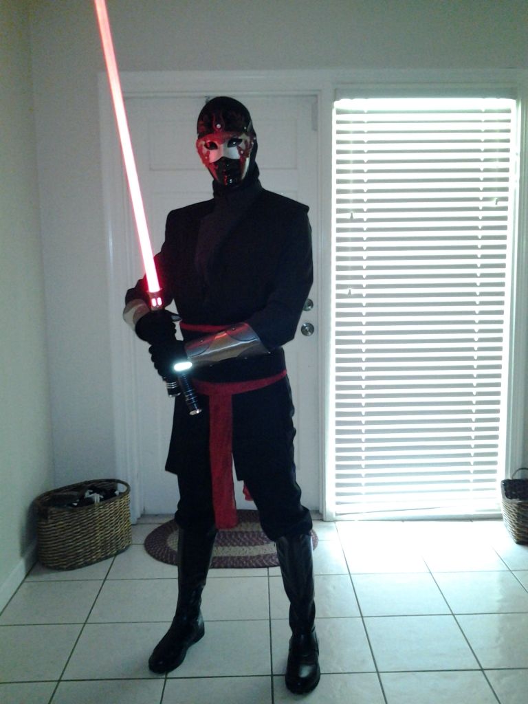 Thanks much appreciated. The mask is a two peice set up, one was a simple white mask that I painted and the other was almost a mardi gras type mask I bought then painted and made adjusments that I thought would go well with the idea I had of my character. I actually do have contacts I just wasn't wearing them in the picture for some reason. Here's two early pics I had before costume was finsihed I hope it's ok to post since there's no saber in it