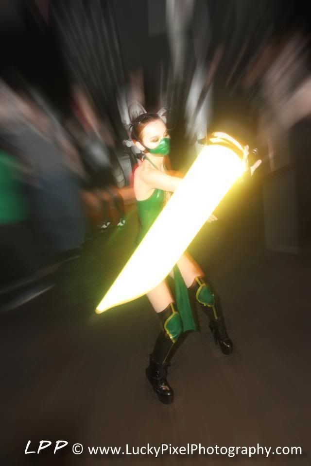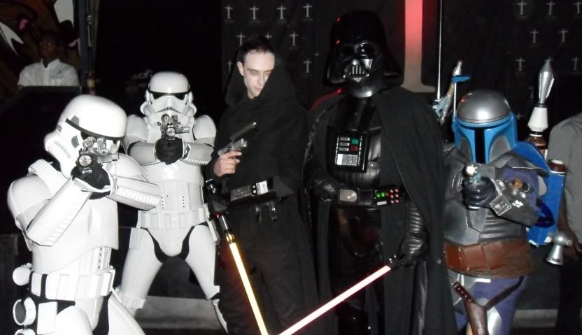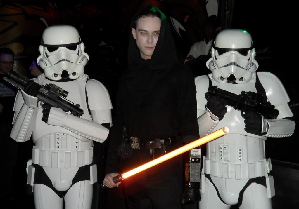 It was Toronto ComicCon this weekend and although I didn't attend the convention, there was a kick-off party Friday night that I checked out. I don't have my Sith costume anywhere near to the level I want it so in a pinch I just wore a bunch of black and threw on a cape. My wife busted out her Halloween costume from last year - a Stormtrooper catsuit she made. There was another Ultrasaber wielder at the party (I recognized his Liberator emitter from across the room!), but he's not active on the forums so I can't give him a shout out. Me and the wife (yes, she's aware that she's a bobble-head)   I was hoping some other Imperial types would be there and I was in luck!   My friend Mika (as Jade from Mortal Kombat) took my saber for a spin  With such an exquisite saber, and the power of the Dark Side, at your command....why bother with a blaster?