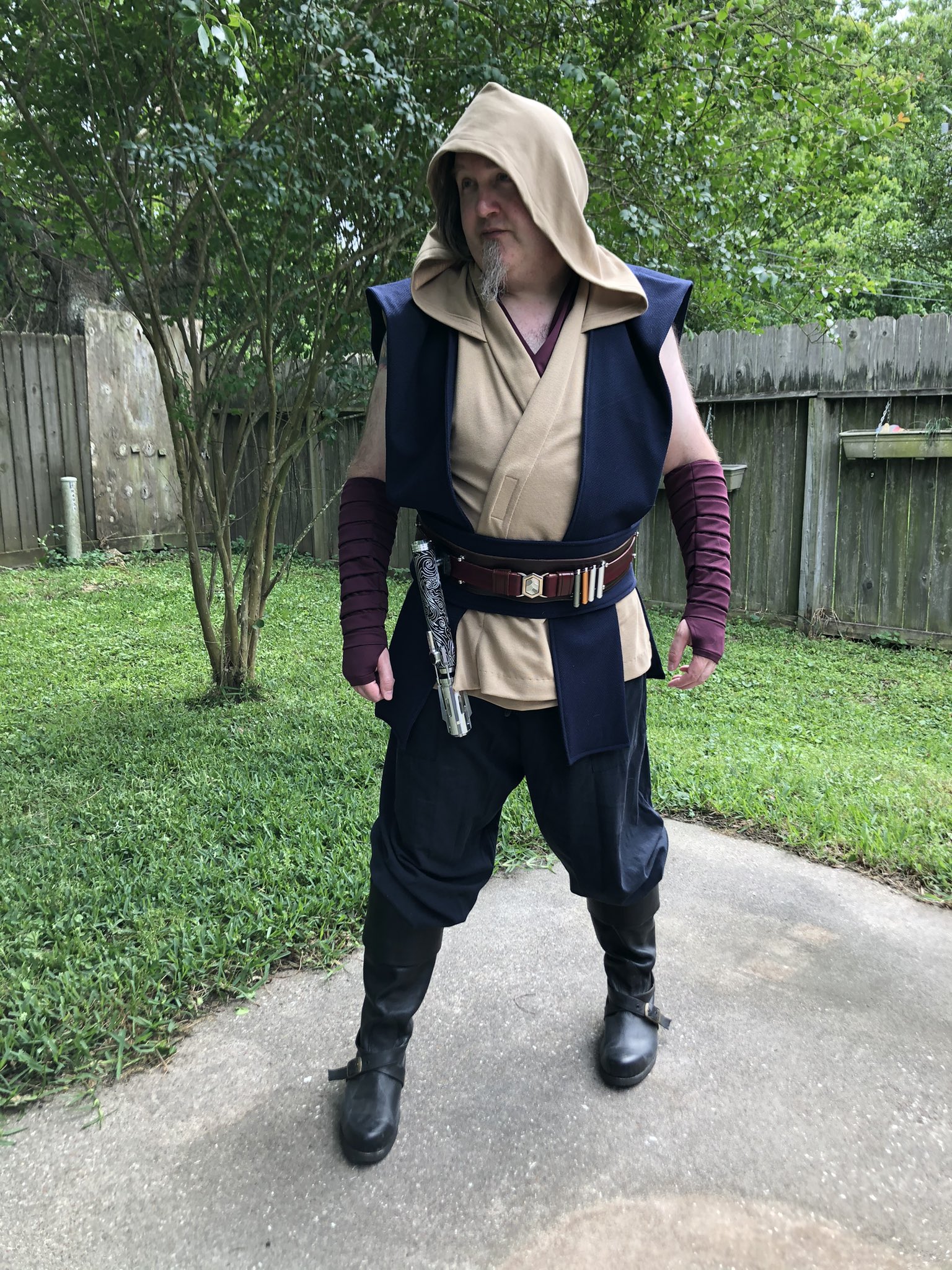 Dang, that looks pretty freakin great overall. It's a good looking outfit with that saber combo, that hilt plays off the base colors of the outfit well! It's like it pops well with the more traditional colors of the overall outfit, so it simultaneously draws the eye and completes the look. I'd call it a win for sure.