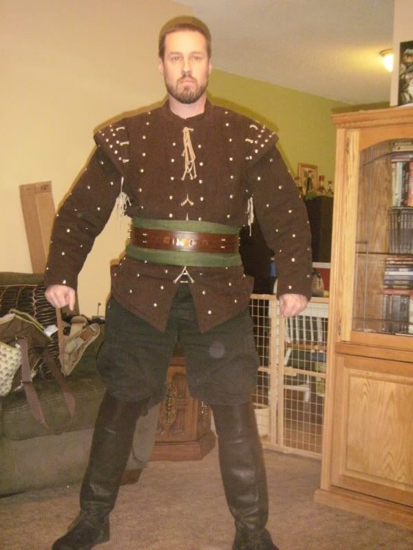 Okay, new pics. The gambeson is actualy brown corduroy with brass studs. I know its probably hard to tell from my pics. LOL  This is with the sleaves attached for more of a jacket type of look, which was sugested. Also added black gauntlets, and some green linen that I had laying around, under the belt  ( that was the color the wife sugested) I also have some maroon linen ,and some black velvet scraps that could be used under the belt also.  I got pics with and without my cloak. Also my boots can be turned up or down.