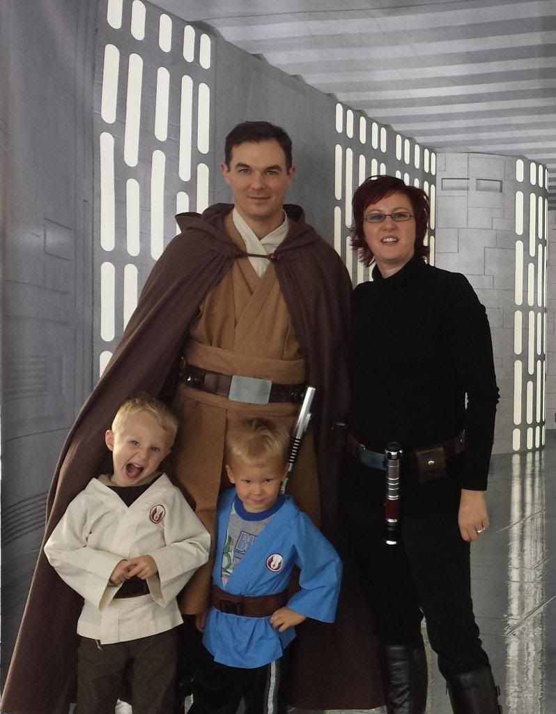 Me, my wife, and my junior Jedi in their home made tunics. This is in front of a back drop they had hung up. Looks like a nice family vacation on the Death Star  Cheesy