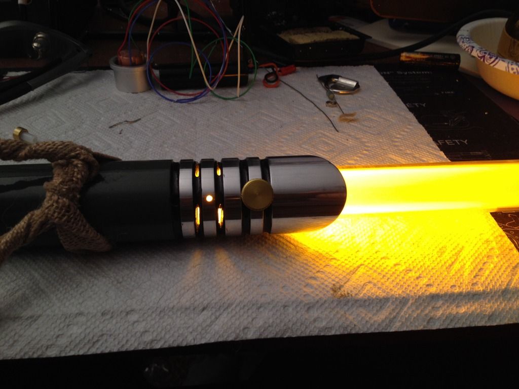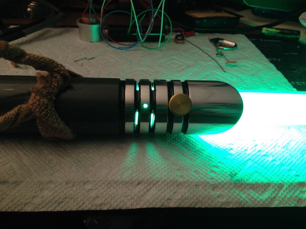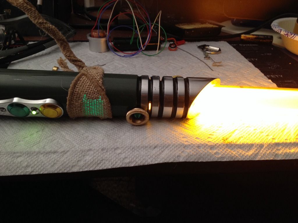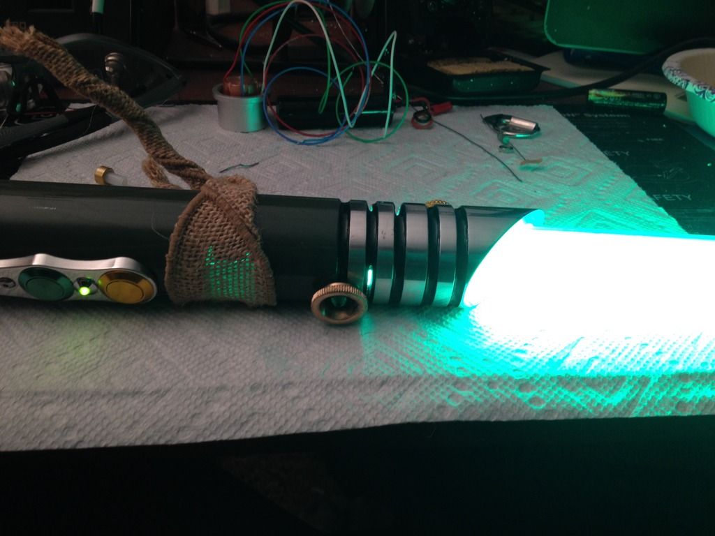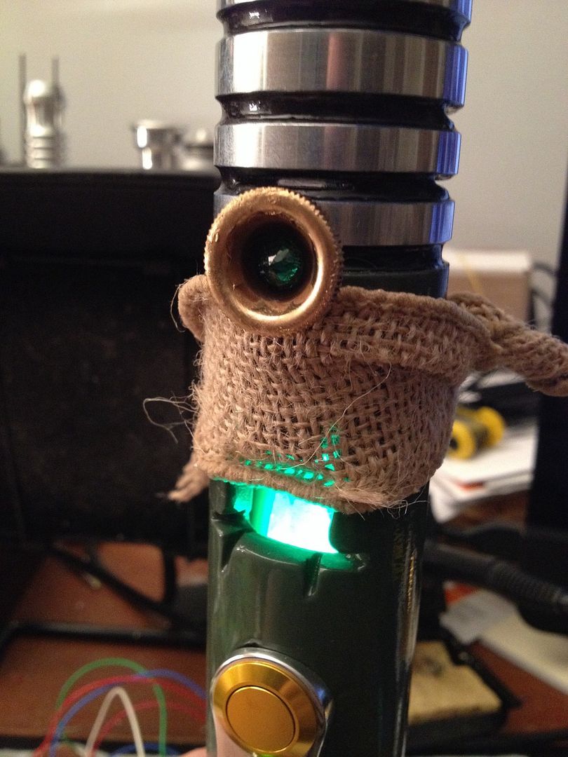 The green/ Gold combination looks fantastic and the cheesecloth accents give it a sort of visual history. This saber looks like the weapon of a very old master, that has seen many battles, but has also seen the senate chambers and has called the jedi council his home.
