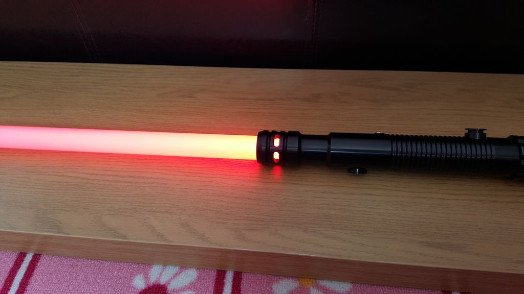 Its Blazing Red with a subtle flicker. Sound wise, it has the DarkTron font which I picked up from this forum. Its sounds so evil. A perfect compliment to the Sith Red.