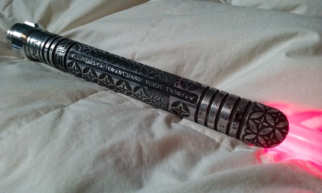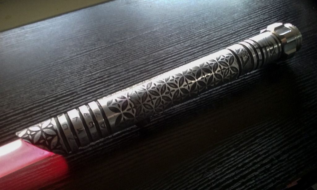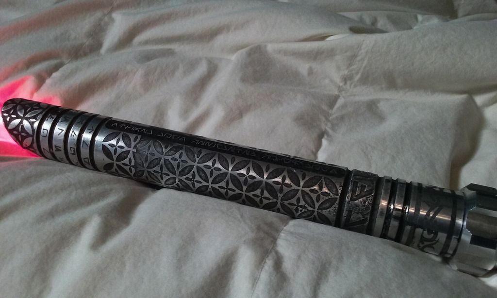 A few months back, I got a Standard Issue as a grab bag. Love this hilt, but after a while, the plain-ness of it started to annoy me. So, I etched it (Ferric Chloride). And changed the LED to a Deep Red, running with the USB Power bank set up described in another thread. This is my first etching, for sure will be doing more...    That is an awesome saber. Very well done. Point to you