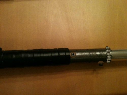 First, the hilt. The hilt came off of an old, rusty pair of shears that the previous tenants of this house left behind. I could have thrown the shears out, but when I felt the metal handles, I knew they could be decent saber hilts. My first step was to take off the green wrapping that was on the handles, and cut them down to size. Once that was done, I had to get rid of the rust that had seeped underneath the wrapping. I then made myself a pommel. I just cut part of the handle off and left enough room for it to slide into place. The pics I have first are in comparison to the other side of the shears. I used the other one to make a new saber for my fiancee. Unfortunately, the one that I had built for her before had a plastic emitter and the threads stripped on the first hit Sad Oh well, a full metal one will be better for her anyway Cheesy The reason the pommel isn't on the hilt in the first pics is because the glue was drying on the handle. I had to pull it off in order to cut the pommel, and then decided to Gorilla Glue it in place so it wouldn't fly apart in tough dueling sessions. This was the result: