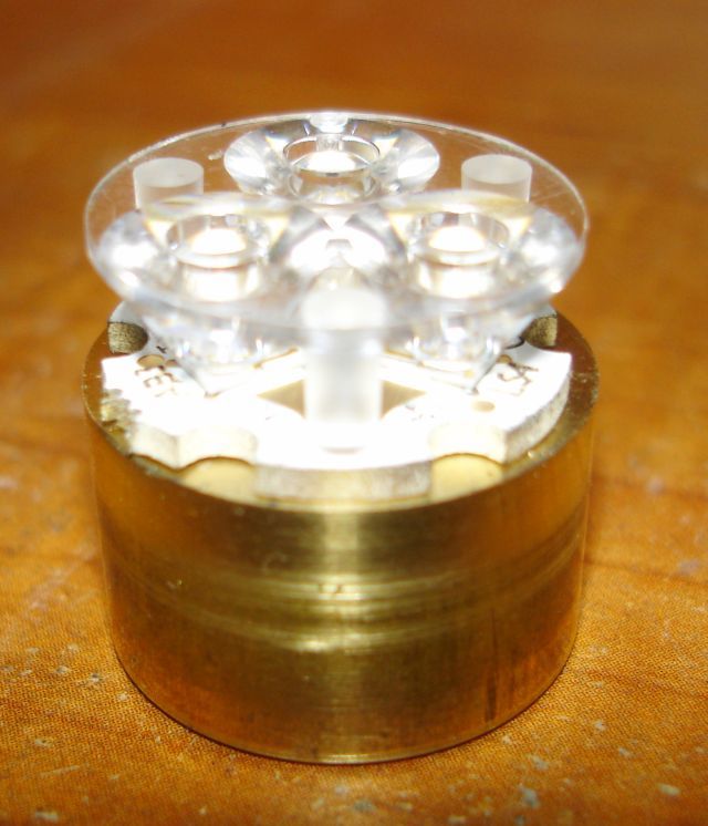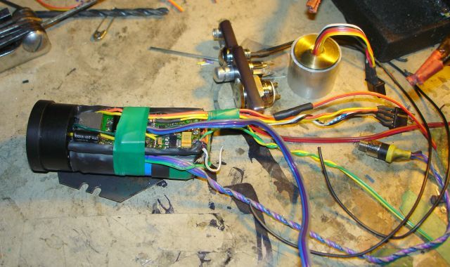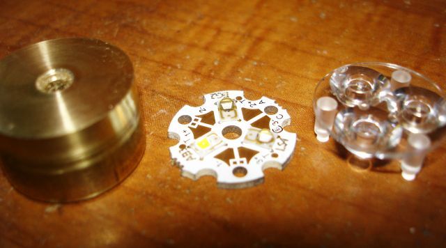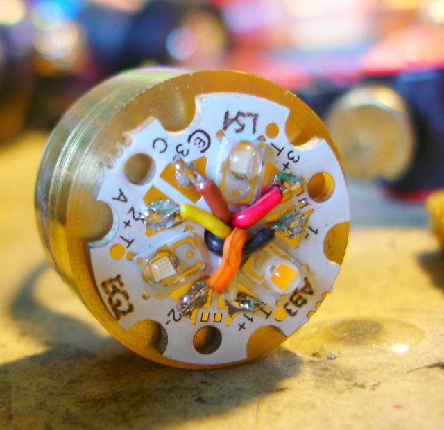 Testing of all components complete outside of the hilt , I wanted to get a pic of this LED wiring in that I really like how simple and quick it was in the pic youll notice 6 wires (28ga.) soldered to each led contact, from there I ran them to a 4 junction deans micro plug with the2 +'s and 2-'s from my main blade led's (blue and cyan) to set them in parallel (yes it is very bright and the color looks like electric blue. I'll get some pics up once it's finished   Some temporary green tape to keep things in place while wiring, you can pretty well see all of the components at the ready, the final install involves wiring up the switches and recharge port before installing the control box