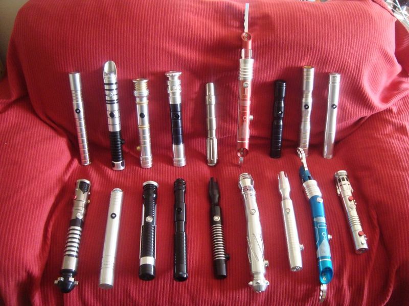 From left to right are the 4 Aeon v2's (3 LE, 1 standard) next are 2 Liberators both stunt, then my initiate stunt, Aeon v3 stunt, Dominix v3 stunt, Dark initiate with Sound and Blue FOC with recharge port. next is the Dark standard issue with vertical grooves stunt, then 2 standard Aeon v4's stunt, next is the Dark Omen Emerald and sound, under those are a raven standard pommel, a war glave pommel and a standard no sound coupler, on the other side are 2 vented couplers one is adjustable. Next is a war glave with silver claws, Green with silver FOC and sound with a dark catalyst pommel, 2 Manticore CE Orance with Red FOC and Sound, and finally a Raven with a scorpion pommel emerald sound and a recharge port. At the bottom are the sword bags i made to help keep the scratches away. Whew my hands are tired Smiley