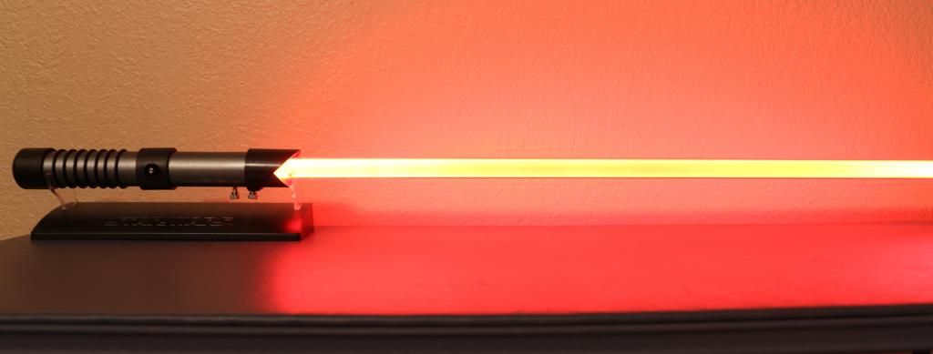 Here you go. A new Dominix picture. In a Heavy Grade blade. =] The way I did the picture looks so real. I used my phone camera. Good quality. And the way the picture turned out looks like the movies and games too. I'll do some more. I'll be using this with my Sith costume. ;o Though I do want to get that new wooden MHS sleeve from the other guys for a newer shroud. It'll be the same shape though.