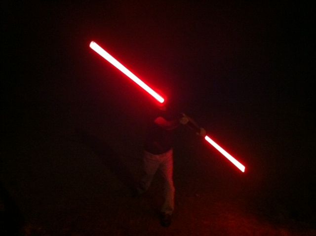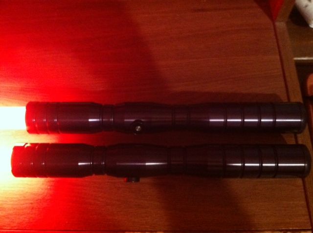 Here you go. A new Dominix picture. In a Heavy Grade blade. =] The way I did the picture looks so real. I used my phone camera. Good quality. And the way the picture turned out looks like the movies and games too. I'll do some more. I'll be using this with my Sith costume. ;o Though I do want to get that new wooden MHS sleeve from the other guys for a newer shroud. It'll be the same shape though.  I like the new emitter.