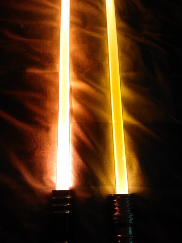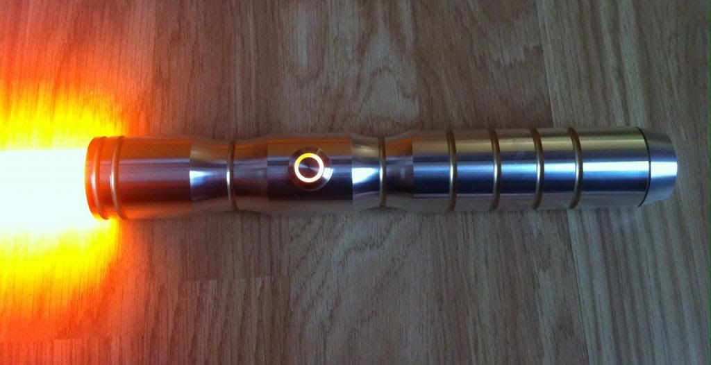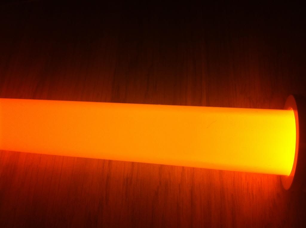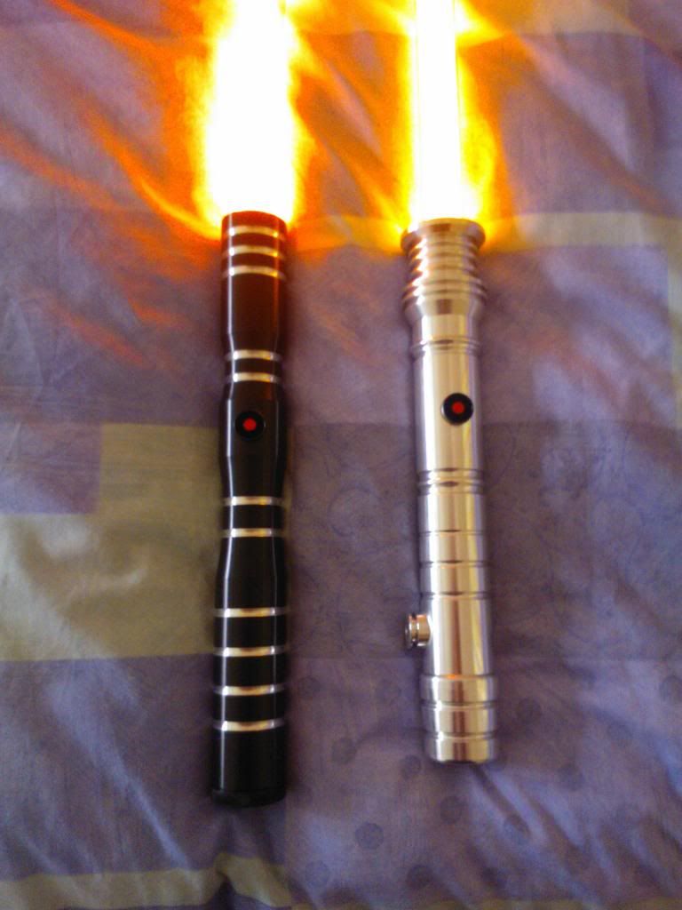 My newest two sabers arrived! I bought a Shock in Fire Orange for a custom job I'm working on, and I got a grab bag, asking for a random forum colour. To my delight, I got a Pyrestone Orange Dominix LE v3! I've really wanted a PO saber, because its always described as a darker, richer Orange, and IMO its a lot nicer than FO. Cheesy