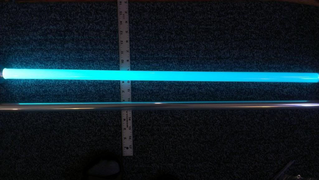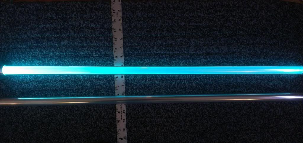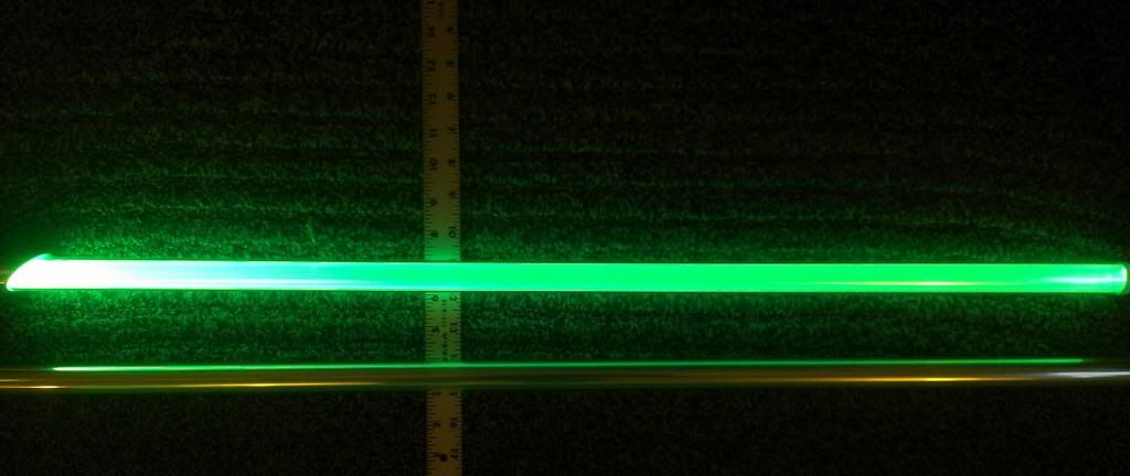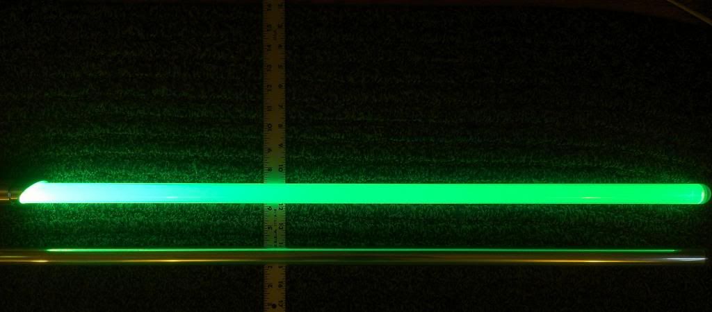 I think it's clear from these that the standard blade is throwing a bit more light onto my carpet & ruler than the Ultraedge (get the pics into a photo program and compare them side-by-side, horizontally, vertically, in segments etc). Does standard look brighter to the eye? Who knows, since I don't have 2 of the same saber to do side-by-side with differing blades.