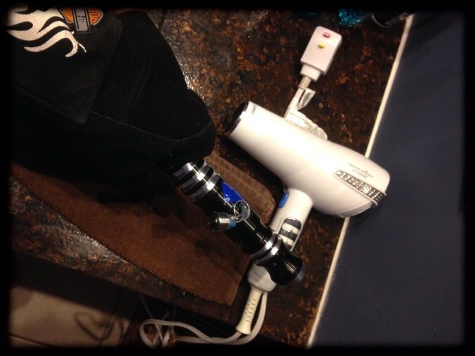I forgot to post this last night: bonus tip for everyone. In case you didn't know - UltraSabers uses a hot glue to set the AV switches in the hilt. They are glued in real tight. So if you want to take one out for whatever the reason, these are your two best friends for the job: A hair dryer & welding gloves. The dryer is obviously to melt the glue. Gloves - because heat radiates on metal so you'll need something to keep from burning the living [NAUGHTY WORD HERE] out of your hands when you take the switch out or otherwise accidentally touch the hilt. It will get really HOT.