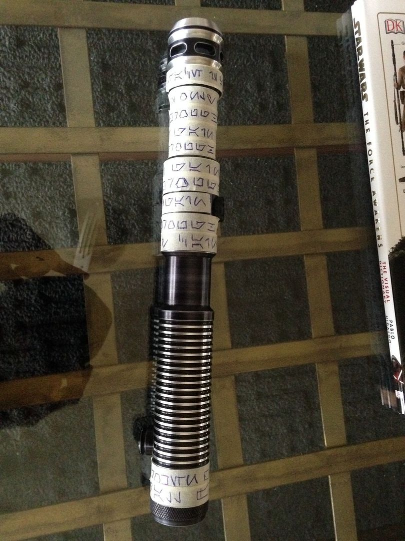next step was to plan/ space out the sith code i'll be engraving using masking tape- it's just way to much aurebesh to leave it to chance that it'll end up spaced out correctly as i go.  i know everybody's prob like "hey man, why not use sith script?!"  but i just like aurebesh for one, i know it so much better and i think it's the most recognizable, plus sith just wouldn't execute well hand engraving with my skill level (that'll be something to get laser engraved in future):