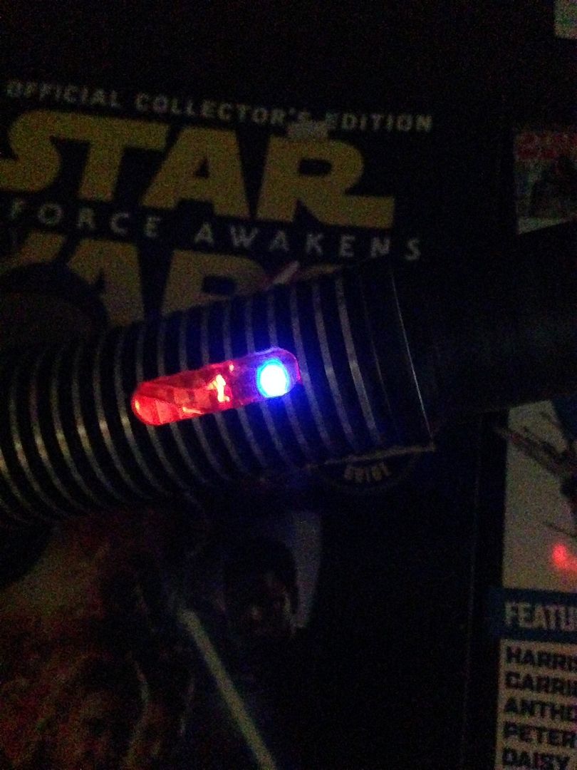 In this dueling mode, as I like to think of it, only the bank's status indicator and the illuminated switch down in the pommel come on, a nice compromise of craziness/ accents spread out across hilt, leaning towards saving most of the juice for the blade.