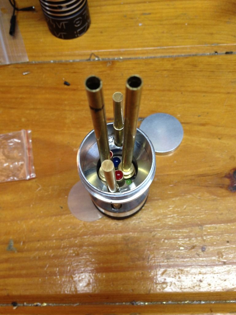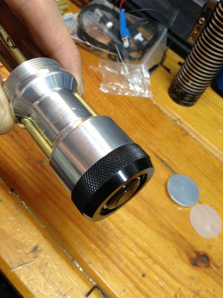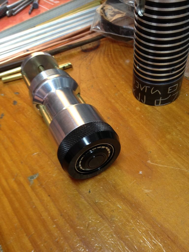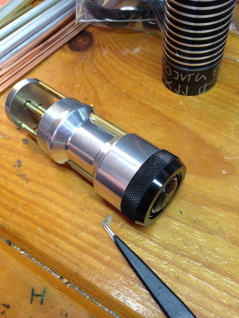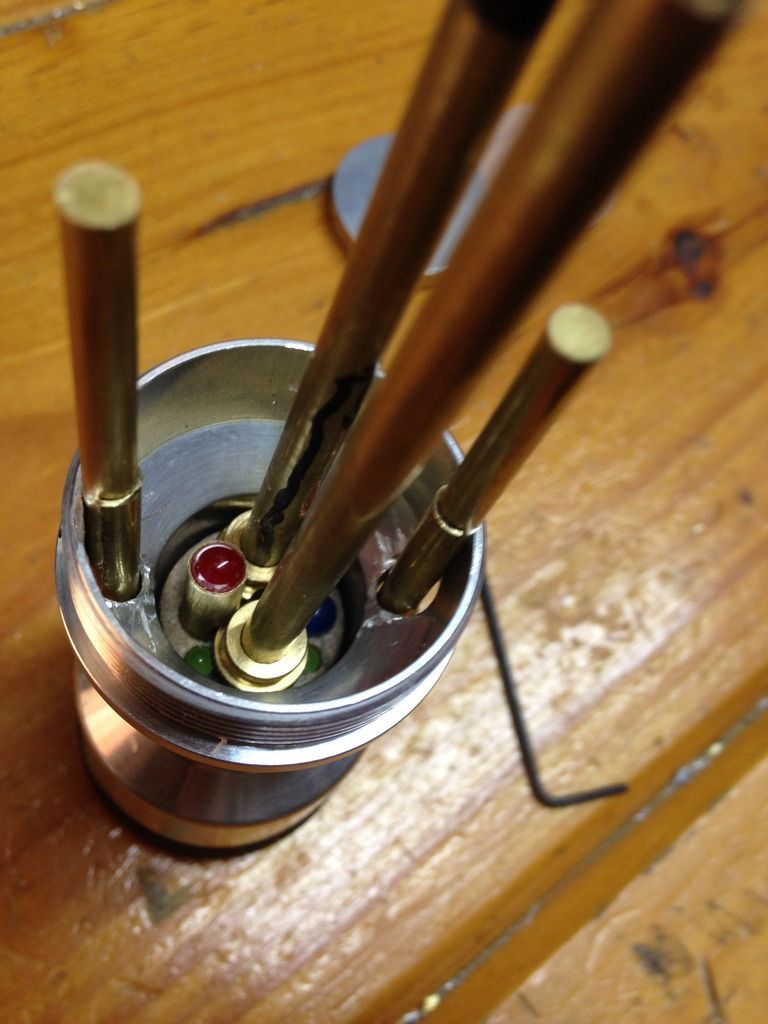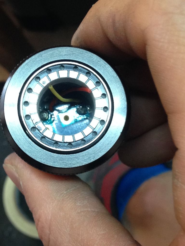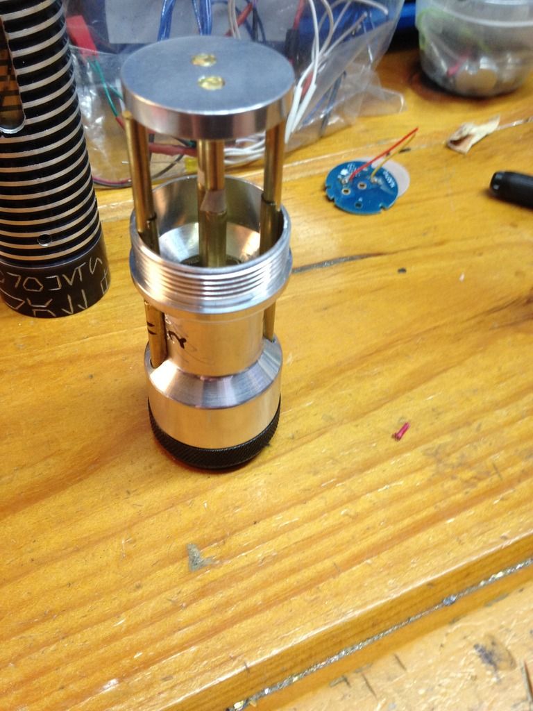 Thanks GQ  . So I'm def gonna be able to recess the plug/ switch a bit  . In these pics the switch itself is pushed out of plug a bit from the wire jammed up inside it but will be seated flush on the plug, which can actually be fit up inside, so a win there. If you look close you can see how switch came out a bit in pics.   Here you can see what i mean about the wider/ sturdier base of support the chassis has now. Of course, a lot of the rods/ tubes that stick up past the threads of the choke will be removed, only about a 1/4" sticks up above.       I still have to wait till further along to show you how it all fits together, but that gap lines up with where the threads for the choke and vented pommel come together. A piece of circuit board will lock into place between those parts with everything run to it. The plug is trimmed to length and now has more notches to help the accent legs fit in, and two deep channels cut into the other sides (can't really see here), to allow the rods to slide through the edges so the chassis can operate. You can just picture how they will look with the switch wires and all the 5mm led's and resistors all in that 1" space HAHAHAHA! It's like there won't even be air, just solid packed. Even with the circuit board trick, I'll likely have to carve some more contours into the inside of the plug for the resistors. Alignment     Keep you posted  , MTFBWY. Thoughts are with everyone affected by the tragedy in Florida.