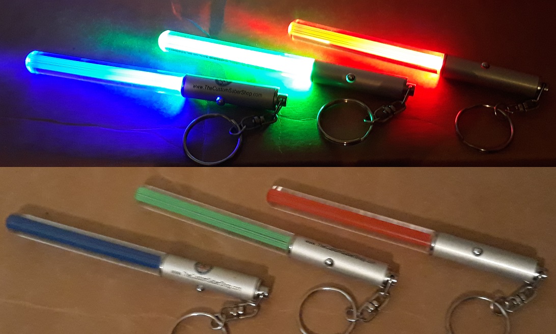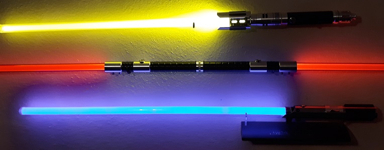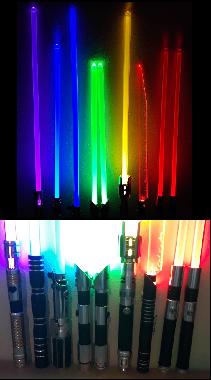 Warning! multiple photos inbound: Here our collection so far, Taste the Rainbow:  Left to Right: My Sentinel LE v5 w/ lite sound in VA & Purple blade Wife's Dominix LE v3 in AB & Blue blade Oldest son's Anakin FX saber My 2 Initiate v2s in Tri-Green with photon blades Oldest son's Fallen that just arrived in Tri-AS w/ yellow disc & v4 Sound My RBG saber with flat acrylic 'Dark daber' Youngest son's 2 Aeon v2's with Red blades  I've shared my & my wife's wall mount already, but here it is again followed by my boy's wall mount:   Bonus! - Adorable little lightsaber keychains from TCSS:  how did you get the colored blades?