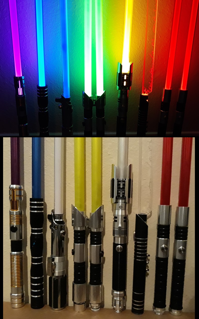 Warning! multiple photos inbound: Here our collection so far, Taste the Rainbow:  Left to Right: My Sentinel LE v5 w/ lite sound in VA & Purple blade Wife's Dominix LE v3 in AB & Blue blade Oldest son's Anakin FX saber My 2 Initiate v2s in Tri-Green with photon blades Oldest son's Fallen that just arrived in Tri-AS w/ yellow disc & v4 Sound My RBG saber with flat acrylic 'Dark daber' Youngest son's 2 Aeon v2's with Red blades  I've shared my & my wife's wall mount already, but here it is again followed by my boy's wall mount:   Bonus! - Adorable little lightsaber keychains from TCSS: