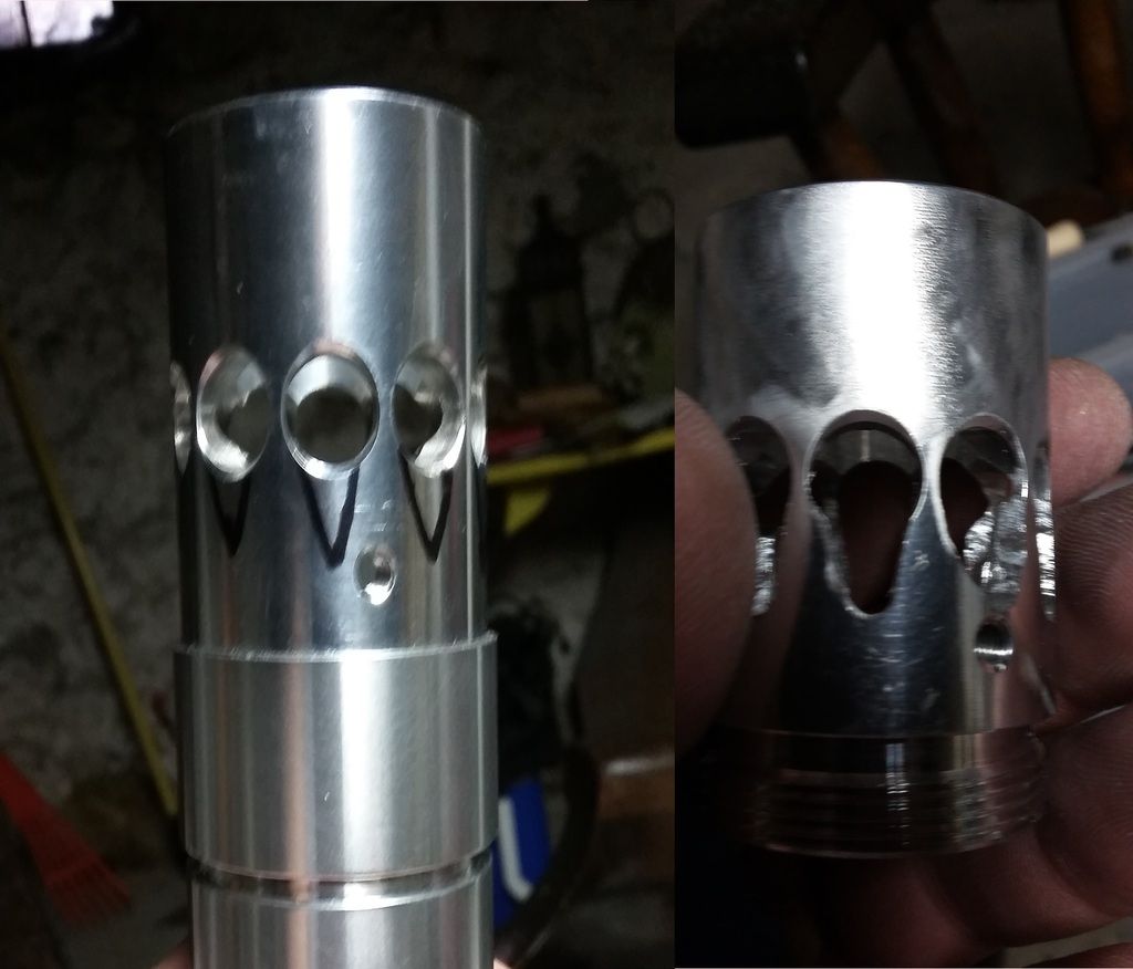 Phase I - windows in the emitter Bigger. As i quickly found out the aluminum is alot tougher than some would think. the outer sleeve, easy, the inner core MUCH thicker. i drilled pilot holes, took some meat off with my dremel,( careful not to mess up the existing shape & weaken anything) then switched to needle files to get the shape/angles i wanted. (LONG PROCESS, 7 man hrs LOL.)