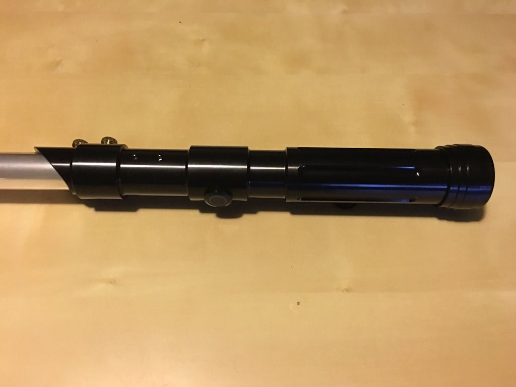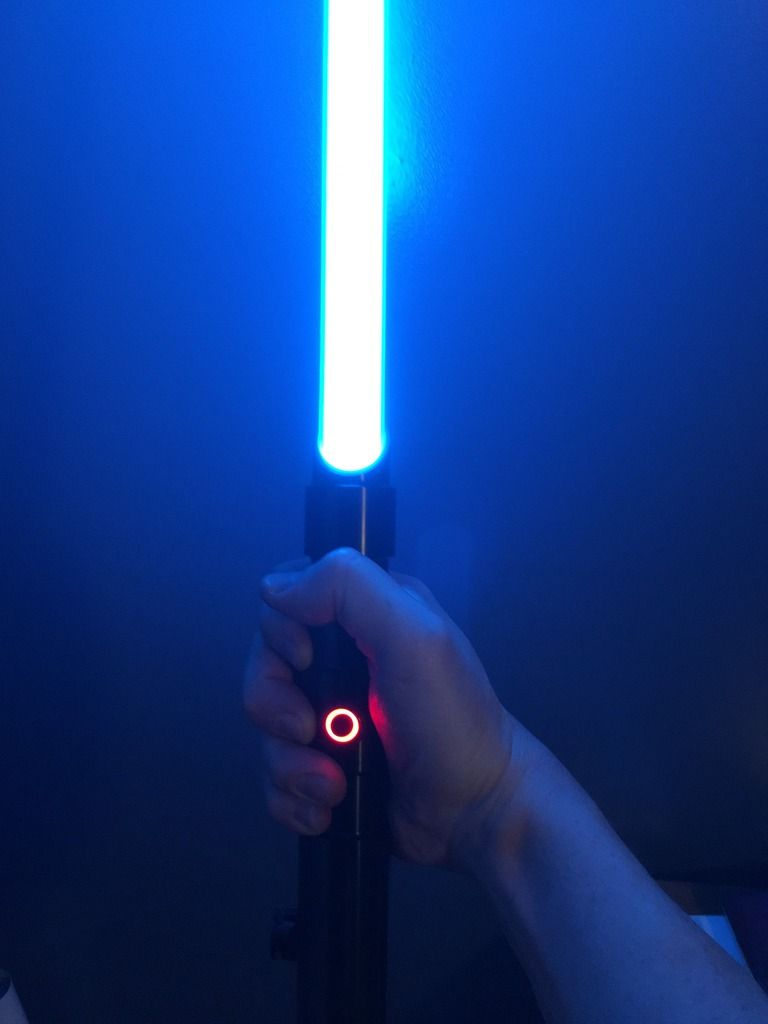 Got another Saber!  I took advantage of the 10% promo, used my rewards points and some bonus cash from work and voile!  The Dark Prophecy V3 with Tri Cree Arctic Blue and an illuminated RED silver AV switch and Obsidian V4 Sound is mine!  I'm really loving this combination of parts.  It's very light weight compared to my last saber purchase, the Electrum Wind, of which I have nothing but AWESOME feelings about (love that one, too!), but this is definitely my first TRI CREE LED where my Electrum Wind was Emerald, and it's a very noticeable difference in brightness, and the new Tri Cree Arctic Blue is just beautiful - even outside while there is still daylight!