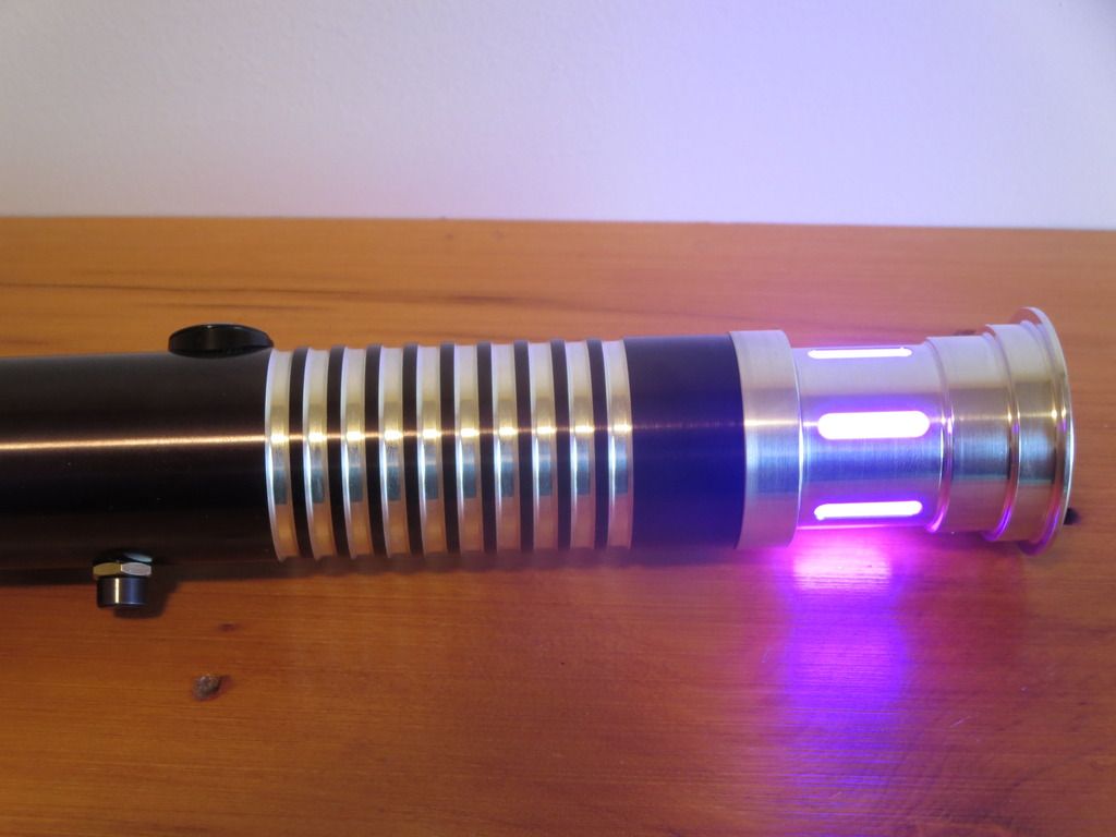 Hi. This is a beautiful saber with the sleek lines that I can fully appreciate. Nice simple kill key and the extra light from the blade plug looks so good. The D-ring looks very sturdy and compliments that pommel. You have a really nice saber collection in multiple blade colors which for me, makes it better. Your photos showing the distinct 3 colors are some of the best. All crisp clear photos.  Thanks for sharing. awesomeness point