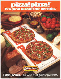 Little Caesar's used to be pretty darn good, I thought. Plus, for those too young to remember the 80s, the reason for their slogan "Pizza Pizza" was because a pizza translated to 2 pizzas. They came on cardboard slabs wrapped in paper.  Yea...Little Ceasers was the king in the 80s and early 90s