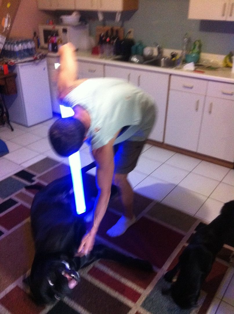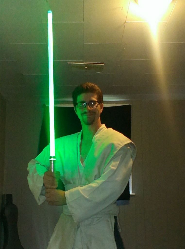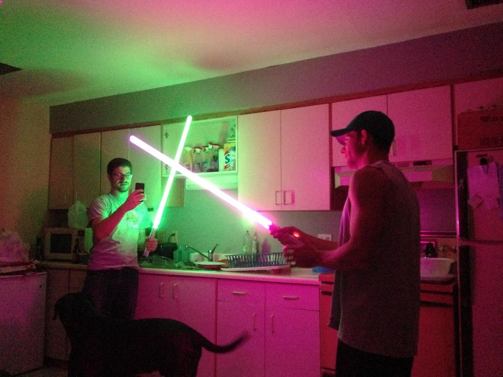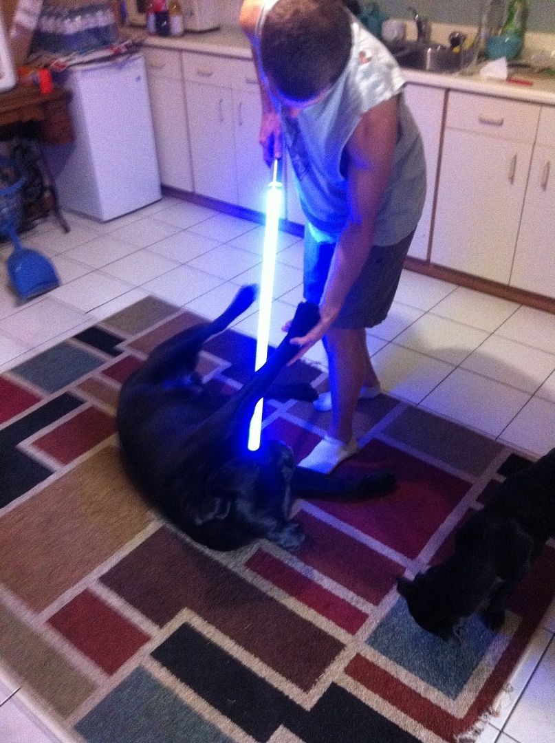 That poor dog XD So I let my bro have my Emerald Green Dark Liberator today. It was his grandpa's favorite color so I said why not. So here's him with his new saber and us together =] I will be getting me an Aeon V4 in Consular Green here in a bit so I'll still have a green saber. Now he needs a proper Jedi costume Tongue