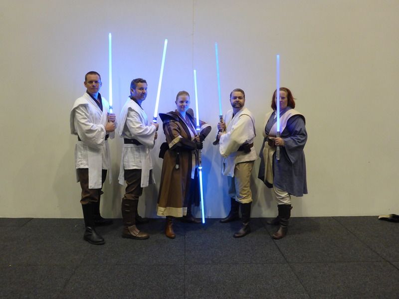 My Rebel Legion Jedi friends and myself yesterday- I don't think I've ever seen so many Jedi trooping together it was awesome!  Complete coincidence we all turned up with blue sabers- and yes, three are US, four if you include the one on my belt   That's a great photo! Seeing that many Jedi together in one place invokes my inner Sith!!! 😁 jk...looks like a mini Jedi council meeting. 😉