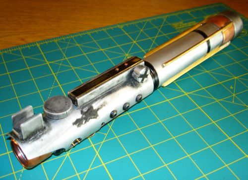 Here is the front section getting ready for a bit more aging & a satin clear coat (misplaced my graflex pins, darnit!) , now it's on to wiring in a cple of small leds in the bottom chassis disc for chamber lighting,accent fiber optic lines(those are the white rods you see on either side of the crystal & waiting for my soundboard (Naigon came out with ver.2 & is up-grading mine)