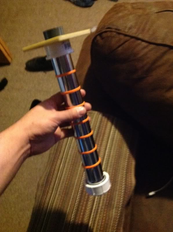 First I started off with regular sink tube 1 1/4, 1 pvc cap threaded and 2 different PVC couplers .First I wrapped fine line tape(orange) around the body to form where i want my grip and spacing. to emitter section that is piece of phenolic board that i used a hole saw to fit over coupling, then i drilled hole for blue AV switch