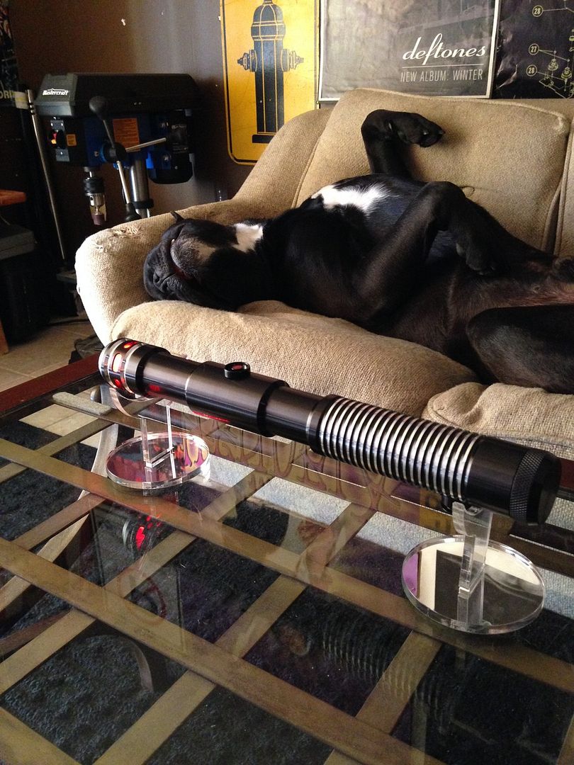 Holy smokes ! US is giving out some really nice grab bags lately. I love the look of your dark Sentinel LE and the circle blade plug looks super with it. Seems like it was chosen to match your furry friend ( who seems to be waiting for a tummy massage ). I have never been able to score a gb with a red LED. Always blue or green. A dark LE saber with red blade is my ultimate in shmexy... or is it the bad boy Siths that are holding it... I get so confused.  Anyway enough of my rambling. + 1 point and thanks for sharing.  Your friend's Aeon LE v3 was the first sound saber I chose. The choke points and sleeker design are so perfect for sparring and spinning. Black 0 rings look good on this saber and also a tennis wrap grip for an easy customization. Am going to both congratulate and whine about him getting a Violet Amethyst LED. My most favorite blade color... as red is in it's own category. Can be used for both light and dark side. Hope he joins the forum soon as there will be an appreciation point waiting for him.