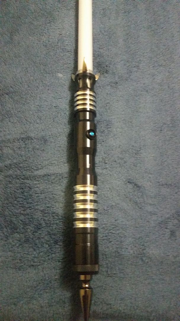 This was my first order from ultrasabers and most definitely wont be my last. I ordered three grab bags, two random colors and one in violet amethyst. The violet amethyst and one of the others are for co-workers and one is for myself. I received two of the dominix v4s one with LE (fire orange), other standard (consular green), both with windowed emitters, as well as a dark apprentice v4 in LE (violet amethyst). I gotta say the moment I picked up the Dominix LE and ignited it, I knew I had to keep this one for myself. I went straight to work putting some claws and a spike on it (after playing around with the other sabers of course), and almost considered doing a leather wrap, but I just loved the sleek lines too much to cover them up.