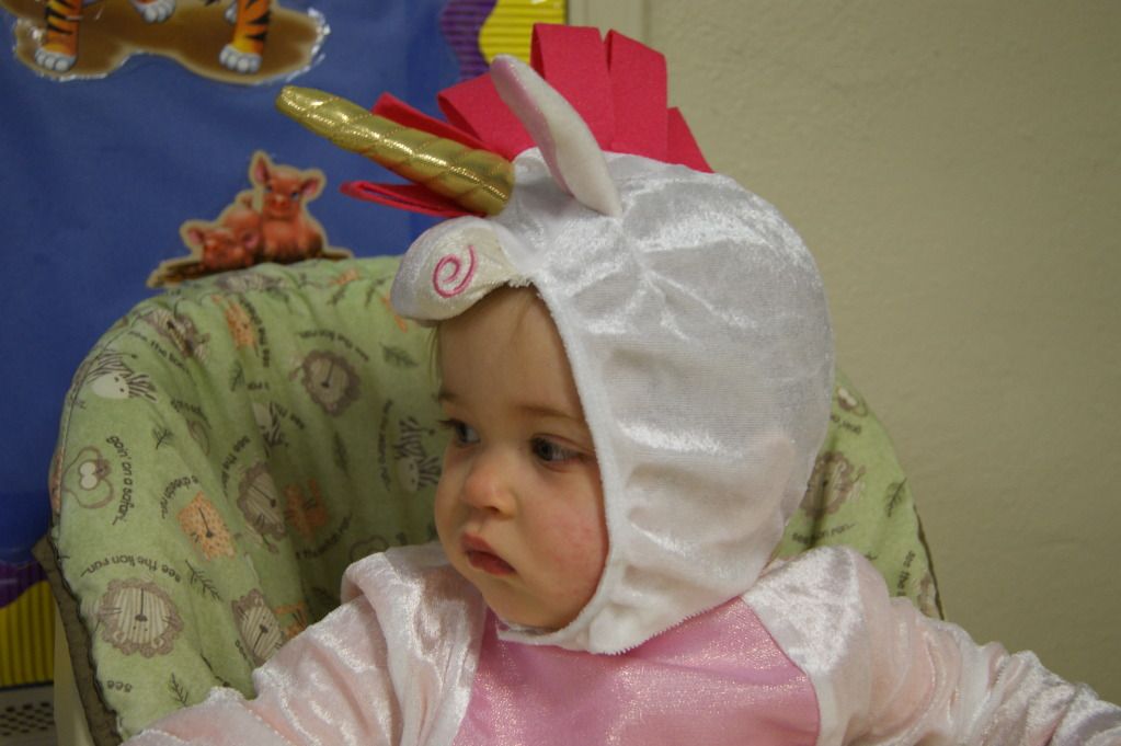 She is just a random unicorn. She really gets excited when Rainbow Dash is on the TV but I could not find a costume for her as Rainbow Dash. I guess Rarity would be the closest.