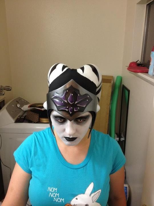 Excellent Costume!!!!!!!!!    For the eye make-up (and lips), have you thought of using a dark metallic looking purple to replace the black?  Would suggest not using it below the eyes, but maybe a single line that contures the lower eye socket.   For the lips, maybe similar to the Queen Amidala look, but with a triangle area on the lower lip.