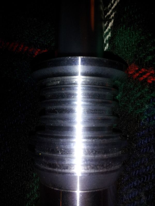 The emitter is fully MHS compatible. Shape and style are vaguely similar to the Consular or Qui-Gon Jinn's hilt, but also have a healthy mix of the Clan Saber style hilts as seen in the Prequel Trilogy. The grooves in the emitter are much deeper than you think, lending the ribs some body and substance. The lower rings stick out about as far as the top disc, and it chokes back to the body of the saber very nicely. All the grooves are wide and deep, and the sort of choke created by the ribbed section provides a nice solid grip if you need to hold the hilt high in a lockup. The disc at the top and the choke back to the body at the bottom also do a nice job of keeping your hands from accidentally slipping anywhere you don't want them without you noticing. Particularly the choke slant at the base will add an instant choke point to pretty much whatever saber you put it on. My only qualm with the emitter is that there's a lot of flat space on the top of it, which doesn't always seem right to my eye. I'd have put a very shallow cupped depression there, but that's just me. This is probably my favorite emitter at this point. I also want to note that the retention screw is hidden in the groove beneath the middle rib, and the hole for the screw only slightly crosses over into the ribs, so the screw is easy to access but very well hidden for show.