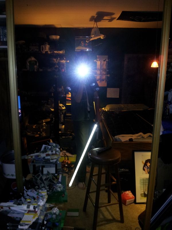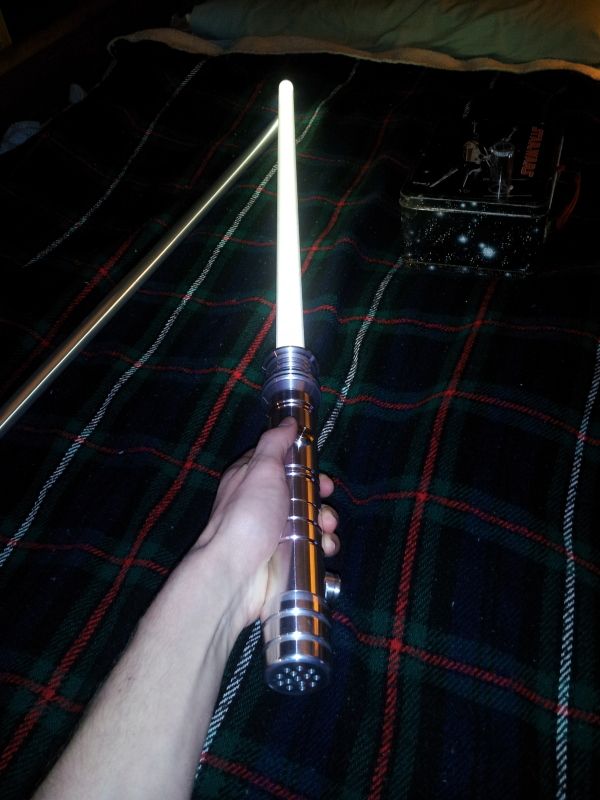 The LED on this saber, if I recall correctly since it's a FoC setup, is a 10 Watt. It is also wired with the Buck Puck Set Up, and due to the fact that all three things tie in to the light this sucker outputs, I'll review them in the same section. I have both Buck Puck and Resistor Set Up Obsidian Sabers, and though I will not say definitively because I don't have duplicate colors among my sound equipped hilts, I do believe there is a noticeable and appreciable difference in brightness when you go with a Buck Puck. As far as the Adegan Silver LED Color, it is most definitely NOT going to make your blade look like a light bulb. It's an AMAZING color to look at, extremely reminiscent of the original cut of ANH. If you watch the older cuts of that movie, the blue sabers are nearly white, with just a faint blue glow about them. Not at all like the more Royal Blue of ROTS. I have an undying love for the Theatrical Edition of Episode IV, so this is a great color to me and fulfills everything I wanted in a Halcyon saber. I also find that on this saber the blade tip is much less noticeable than on my other sabers, blending in more fluidly with the blade and masking the seem. I'm unsure if this is just the LED color, or the blade itself. The Flash On Clash feature is wonderful. I don't believe I'll order another sound equipped saber without it. On this hilt, I ordered a Sentinel Yellow FoC. This is because of two reasons, the first being that in the original cut of Ep IV, the sabers flashed yellow when they hit or locked up. The second is because it is a subtle change from white to yellow, and that looks more natural and less distracting to the eye in a duel. For any who are curious, the flash is sort of an orangey-yellow peach like color, since the yellow and white mix during flash. It's a great look. As I've already given you a good blade photo, I'll give you the same again with camera flash for comparison and to show you how well the color shows in light. Which reminds me, I forgot to mention this LED shows EXCELLENTLY in light!